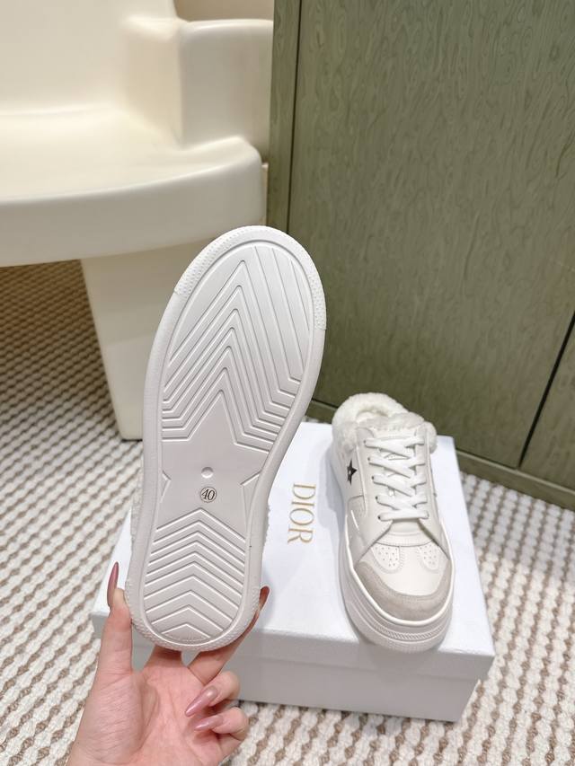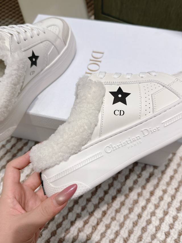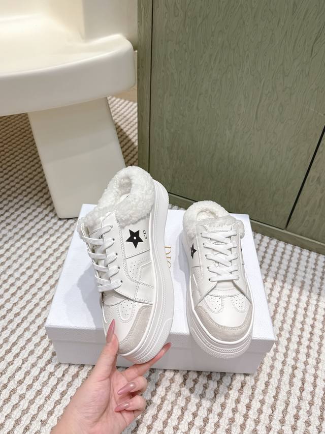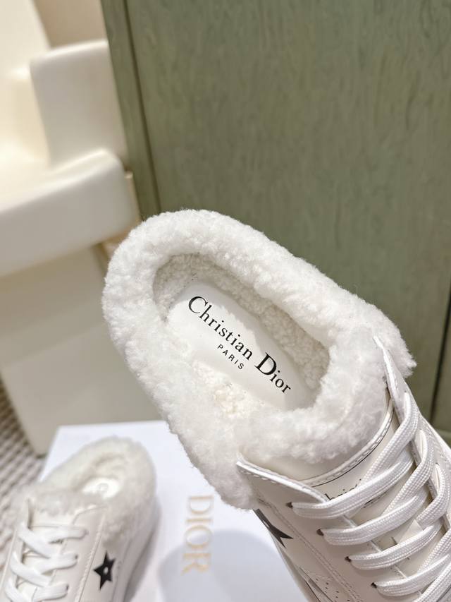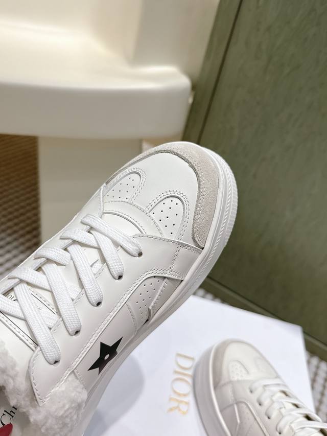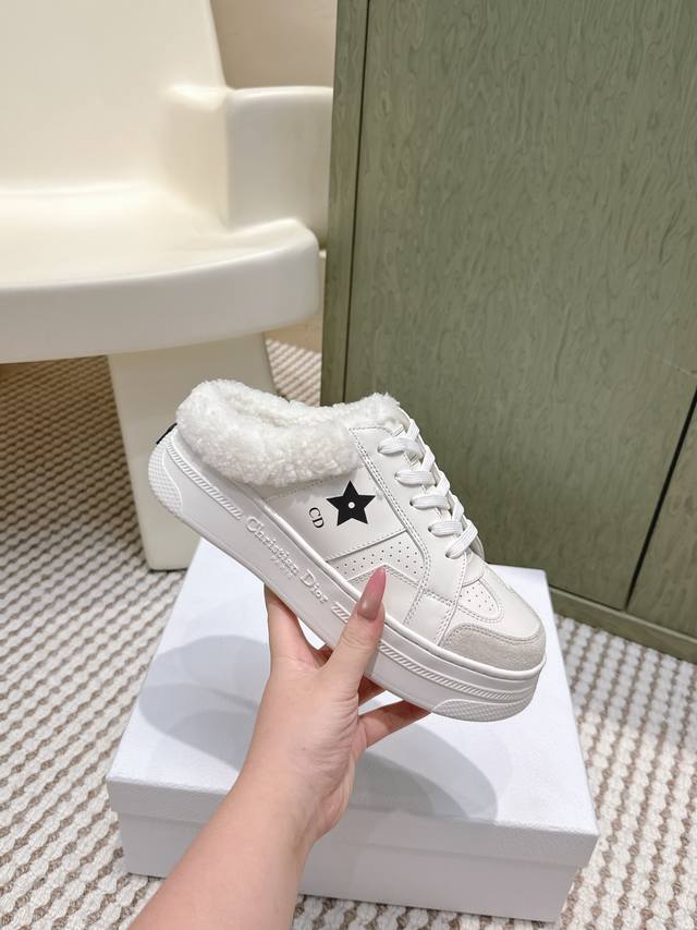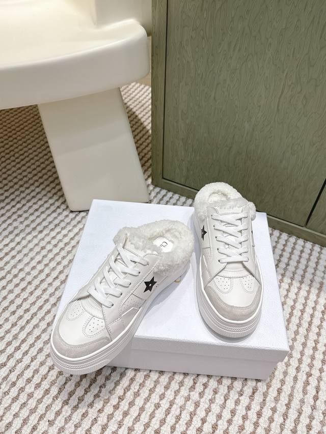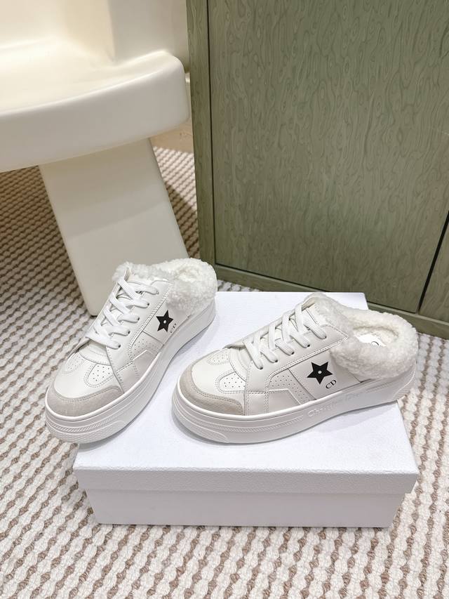 代购级 Dior 迪奥 Star 运动毛毛鞋半托鞋 这款 Dior Star 运动鞋延续经久不衰的轮廓,是新款经典单品。采用白色牛皮革精心制作,饰以同色调绒面牛