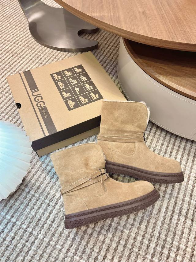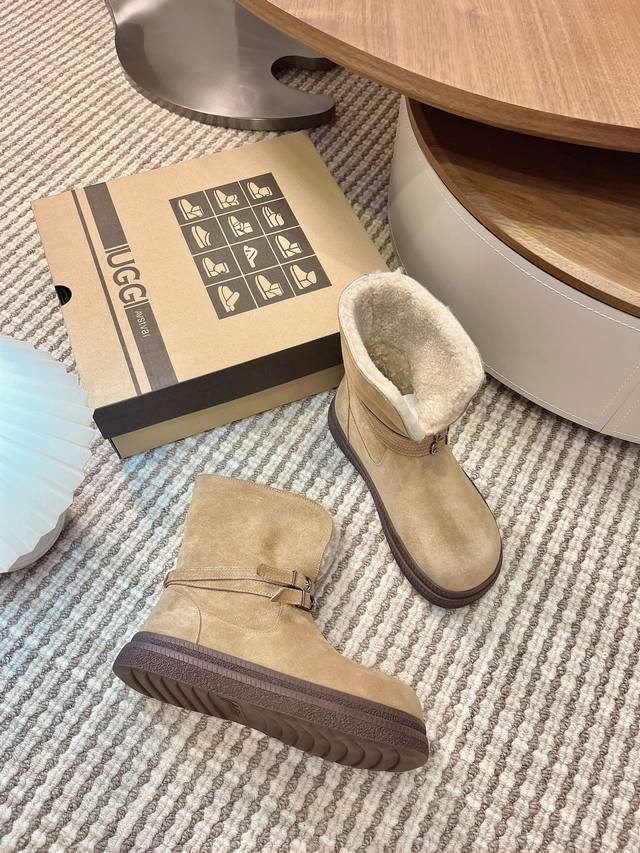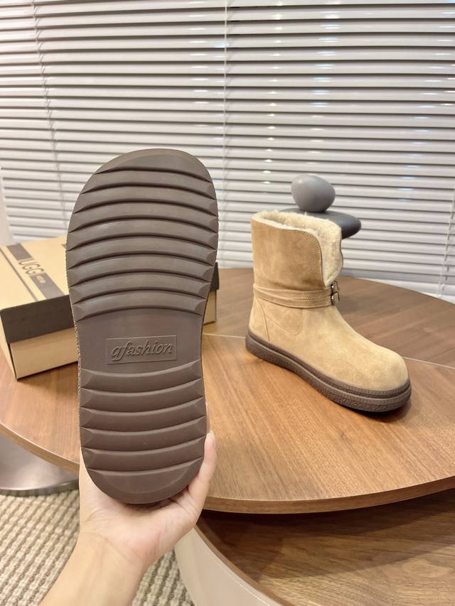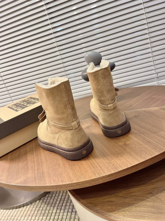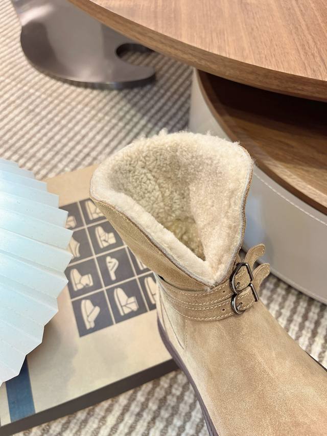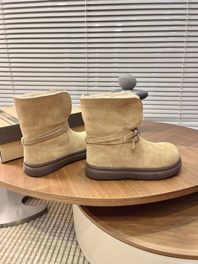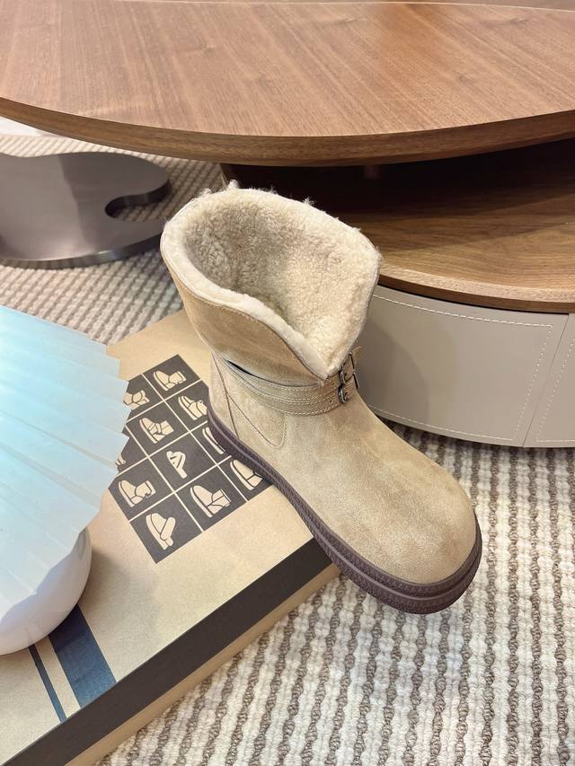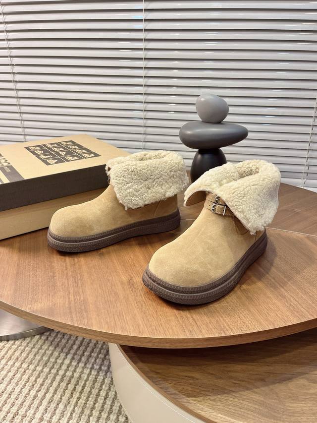 / 实价: 短筒雪地靴 :秒变大长腿 两穿可翻毛 :牛皮鞋面内里羊毛一体皮扣设计 :高筒立起保暖有型 靴筒放下秒变慵懒短靴 两种风格随意切换 奶里奶气 毛茸茸慵懒风