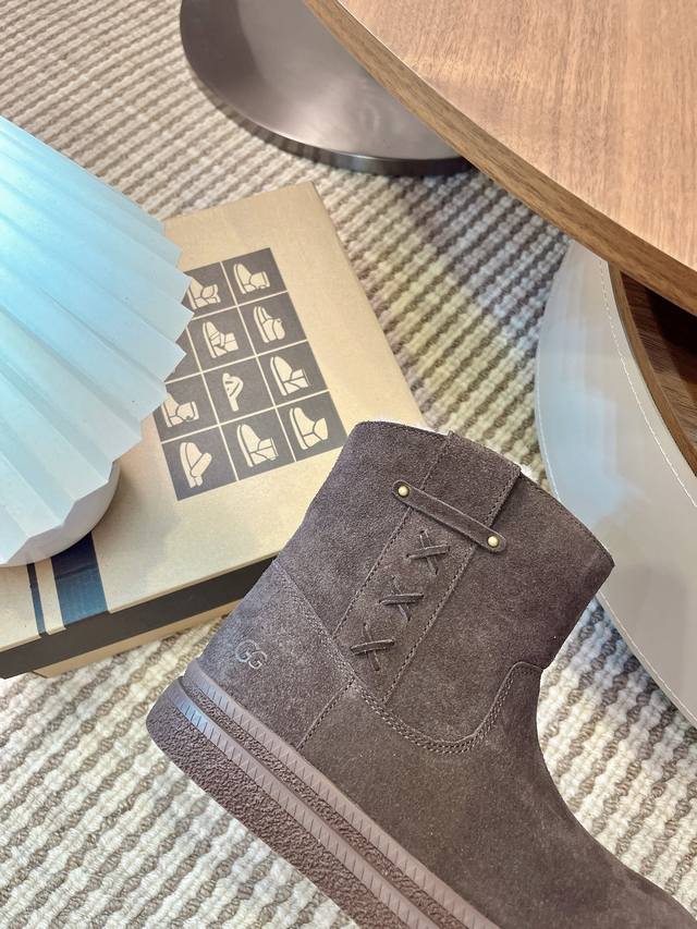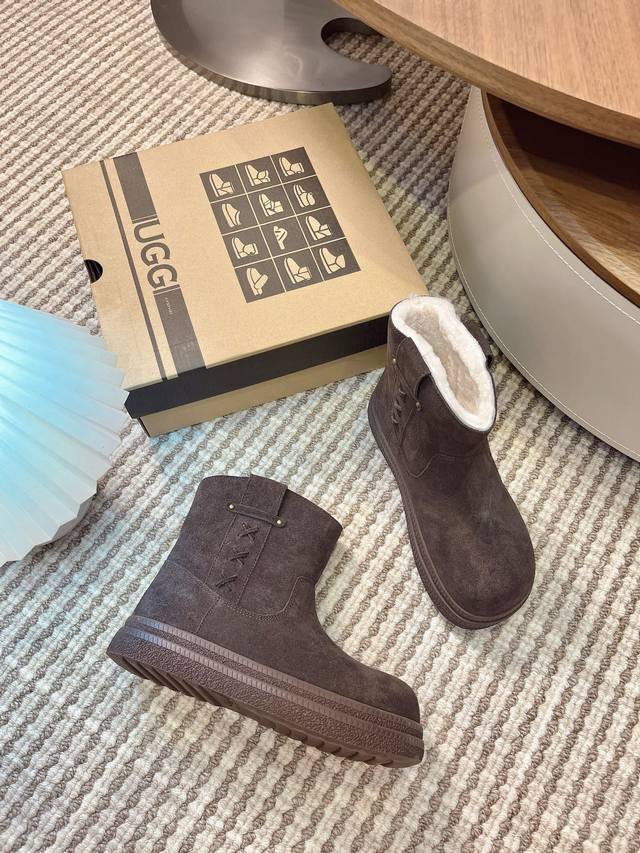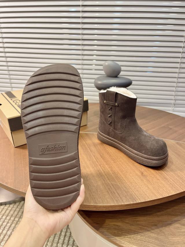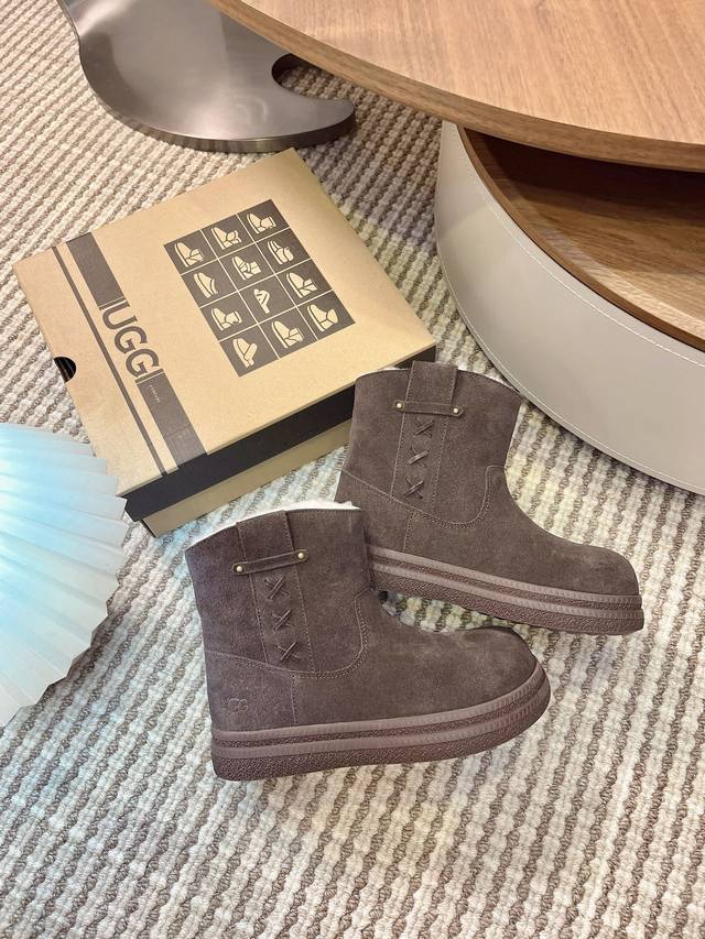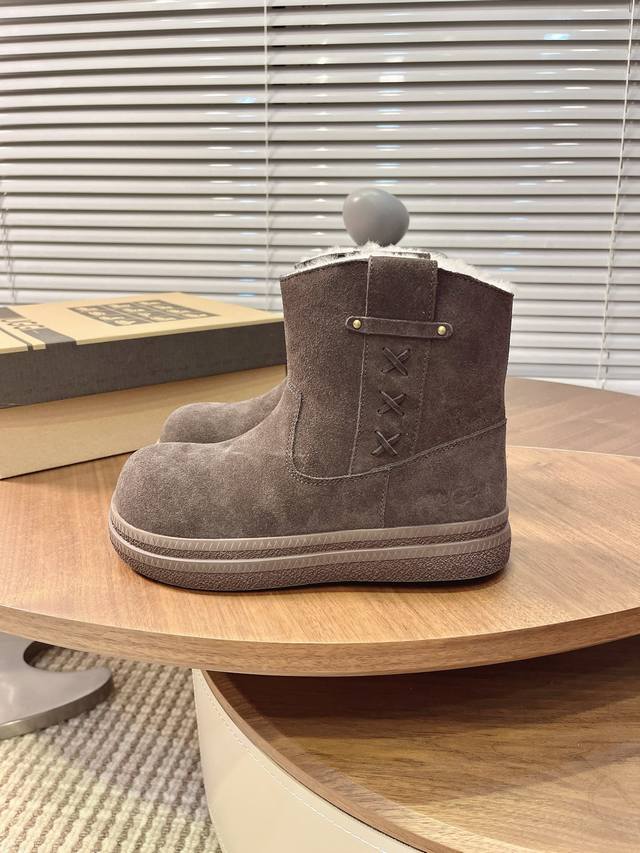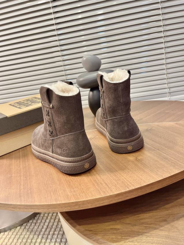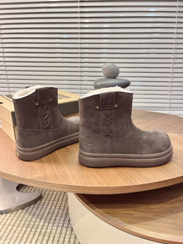 / 实价: 短筒雪地靴 :秒变大长腿 :头层牛皮鞋面内里羊毛一体 :内外侧绑带装饰 厚底设计,防滑大底 毛茸茸慵懒风 秋冬色系搭 配时尚元素爆棚 鞋面:羊皮毛一体