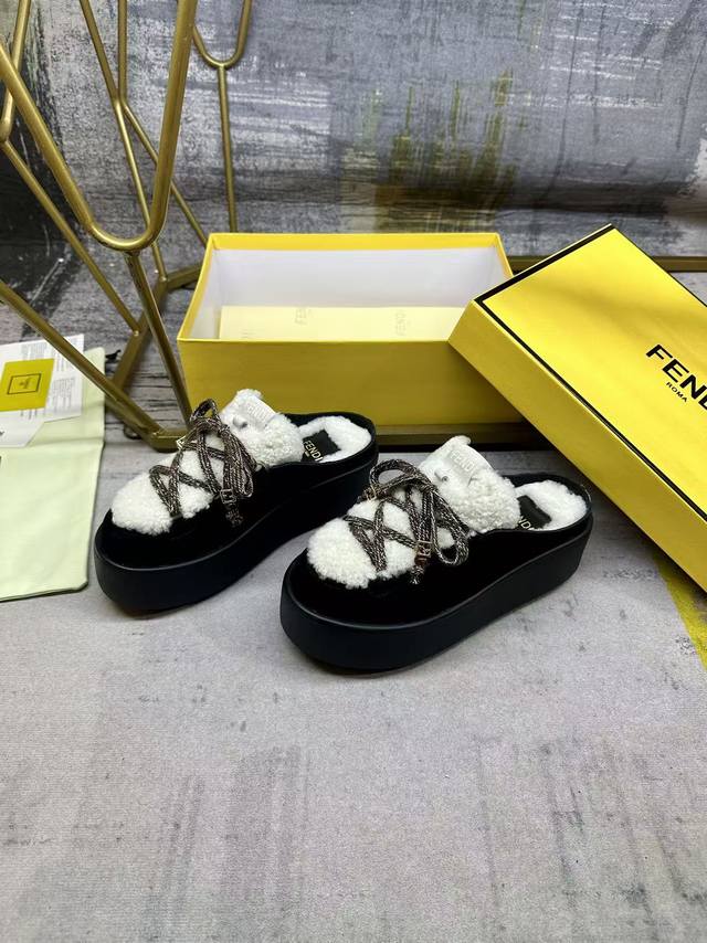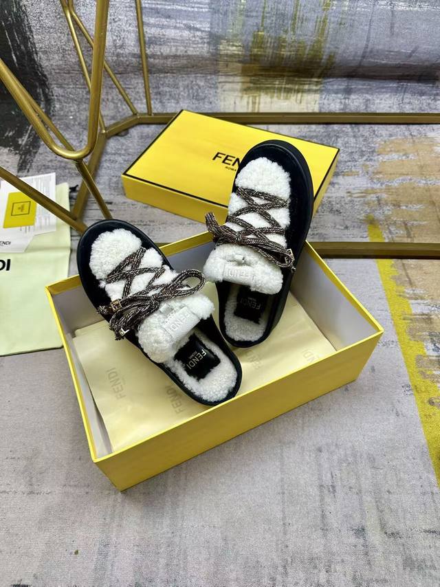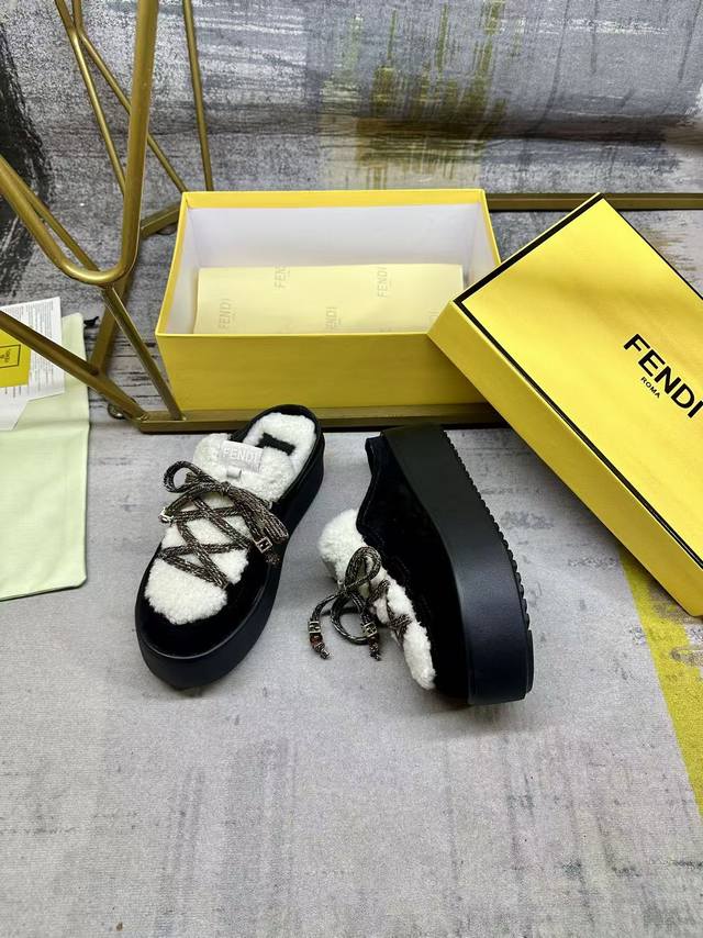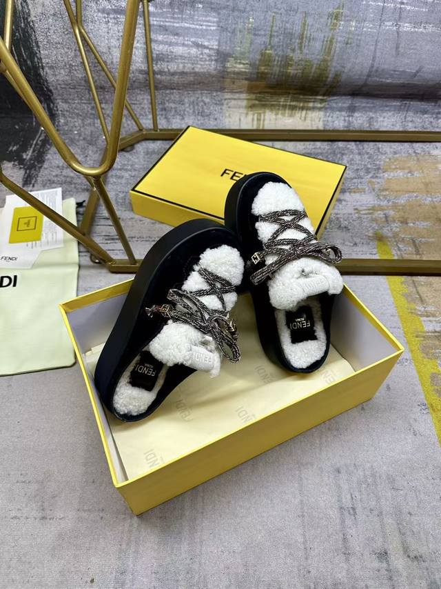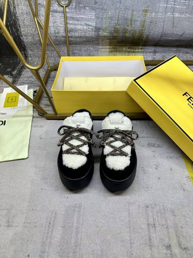 FFF 工厂P价 女装女鞋 运动原单滑雪后休闲圆头平底鞋。黑色绒面革材质,白色羊卷毛鞋面和内底。拼色编织登山风格鞋带,饰有圆形树脂效果金色金属Ff珠饰。厚实同色系橡胶鞋底,鞋跟饰有Fendi字样。35-42码 DDD