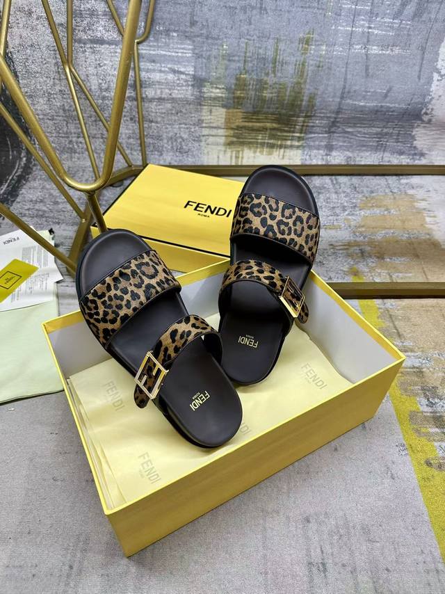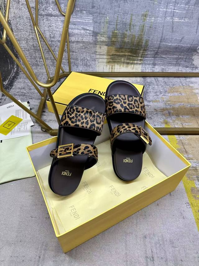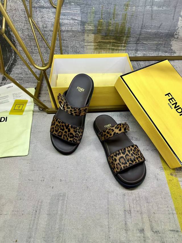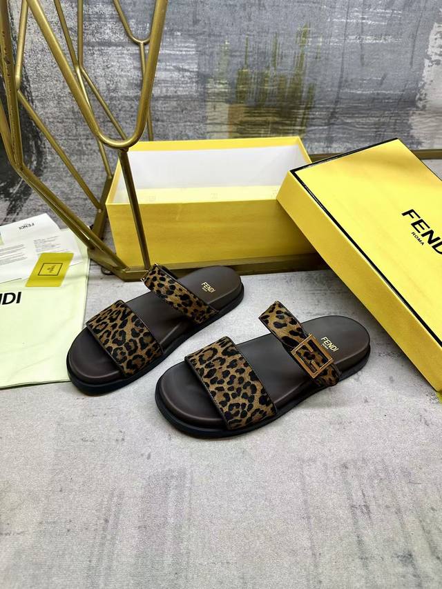 工厂P价 女装女鞋 运动原单 Fendi最新爆款双带平底拖鞋,带Ff装饰性搭扣, 豹纹马毛面料镶边工艺,35-45码 DDD