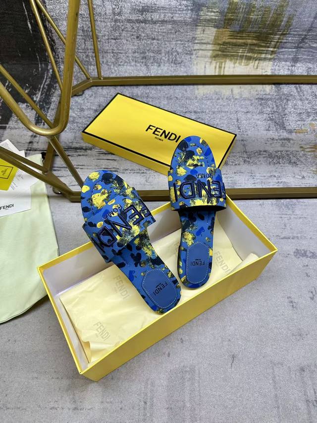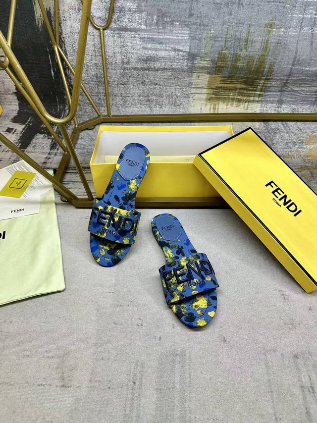 FFF 工厂P价 女装女鞋 运动原单 Fendi最新爆款宽带厚平底拖鞋,蓝黄色印花图案,同色皮料内里垫脚,蓝色Fendi纱线刺绣,35-42码 DDD