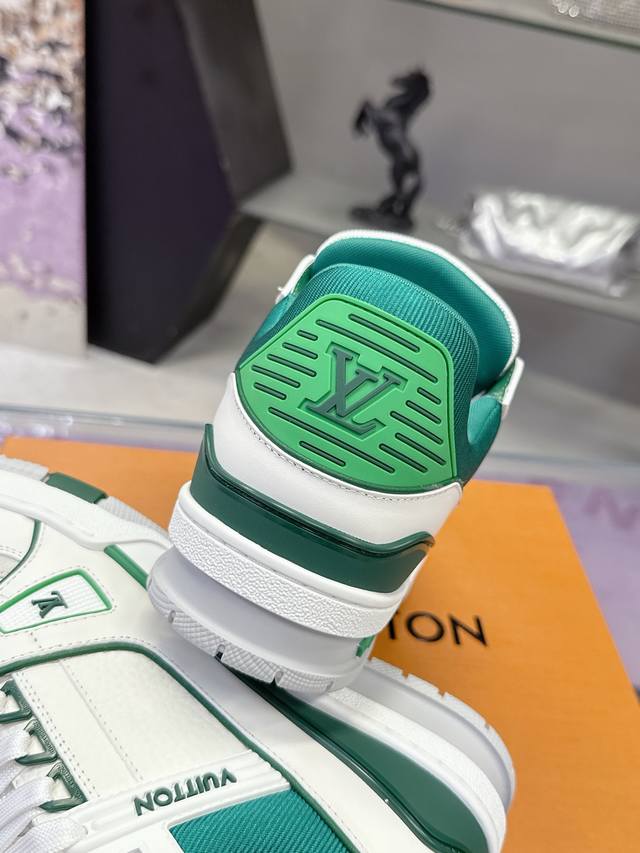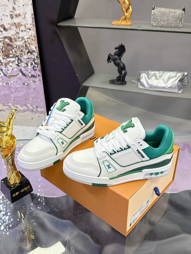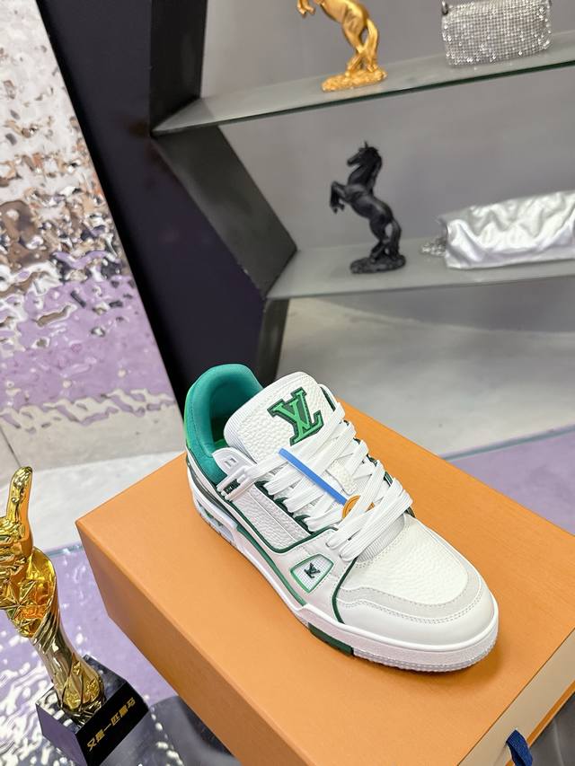 FFF 工厂P价P: 最新色 DDD 本款 Lv Trainer 运动鞋取材粒面牛皮革,以活力配色致意Virgil Abloh受复古篮球鞋启发而创作的原版经典。鞋面点缀橡胶 Lv字母和 Vuitton 标识,外底绽放Monogram 花卉。 DDD 配送专柜精美包装 DDD 面料: 原版定制头层牛皮 DDD 内里: 原版定制透气网里 DDD 大底: 原版开模双色Tpu组合大底 DDD 底厚: 3Cm DDD Size: 女款35-40 男38-46 DDD