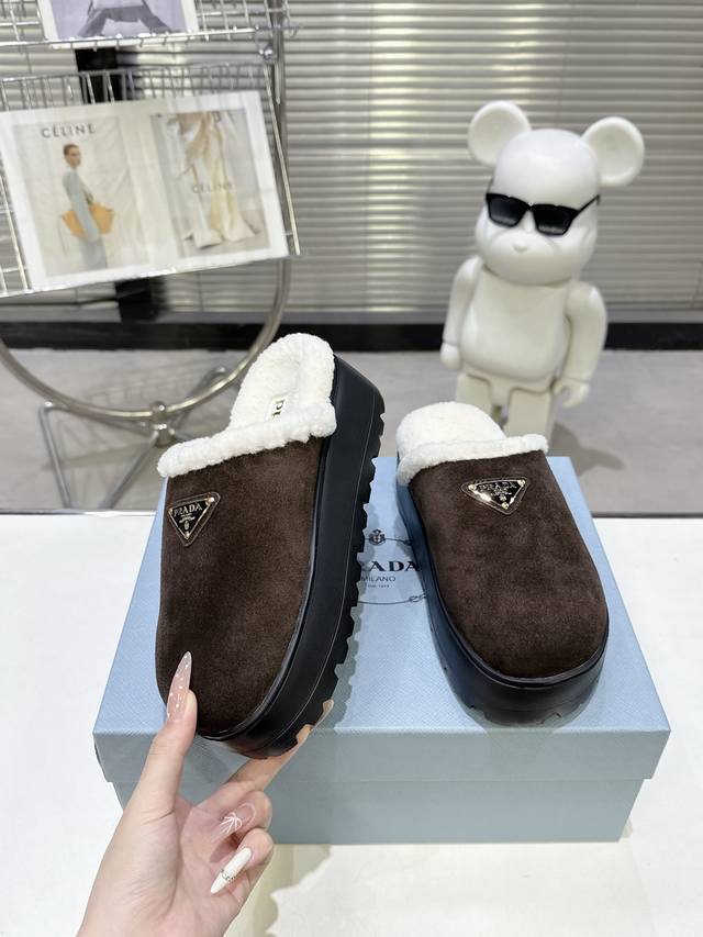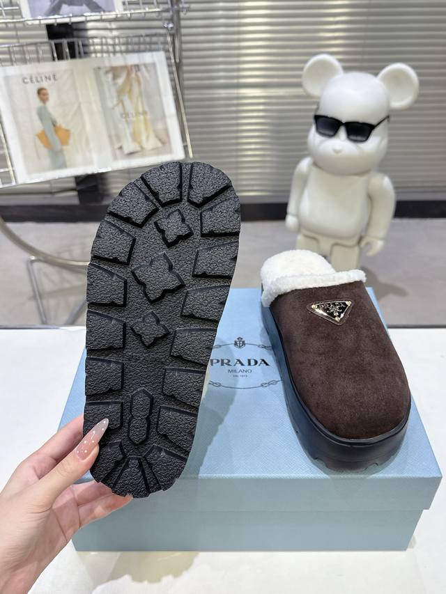 P家最新款毛毛鞋 面:高丝光牛反绒 里:全真羊毛 垫:全真羊毛 底:原版Pu底 经典三角标 Size :35-41 41定做