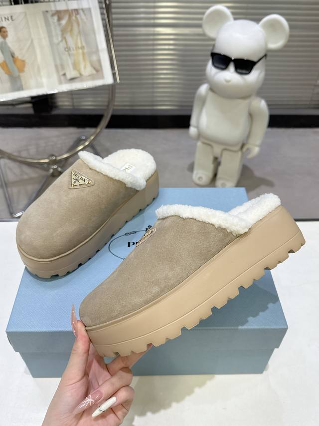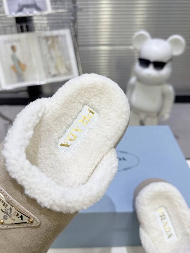 / 普拉达 Parda 爆款秋冬包头毛拖鞋 走秀单品,冬季室内,早春室外。该款羊皮毛拖鞋配有橡胶Ip超轻发泡鞋底,软羊革绗缝图案呼应标志性的Prada三角形,伴以涂