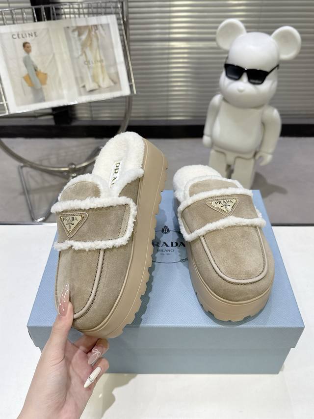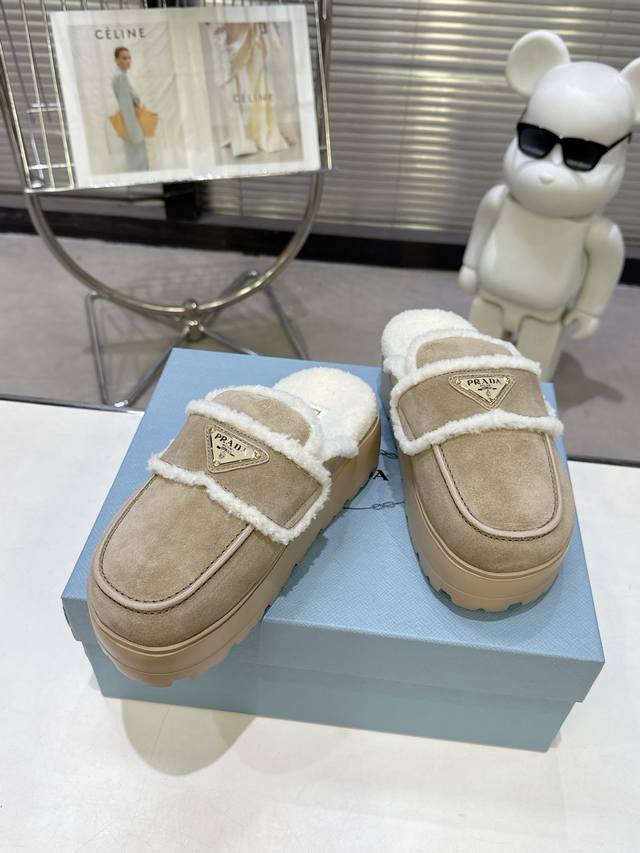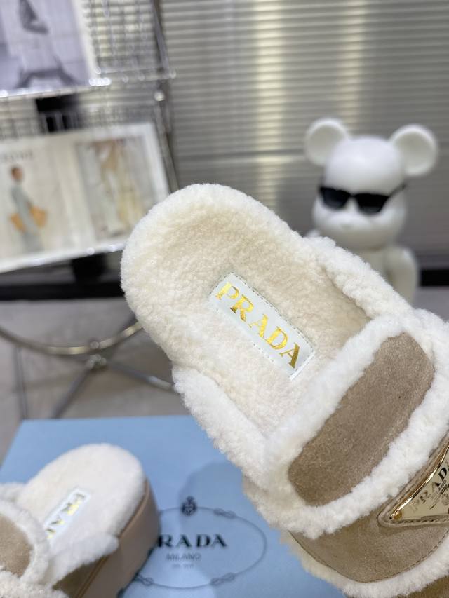 普拉达 Parda 秋冬爆款包头毛拖鞋 走秀单品,冬季室内,早春室外。该款羊皮毛拖鞋配有橡胶Ip超轻发泡鞋底,软羊革绗缝图案呼应标志性的Prada三角形,伴以涂