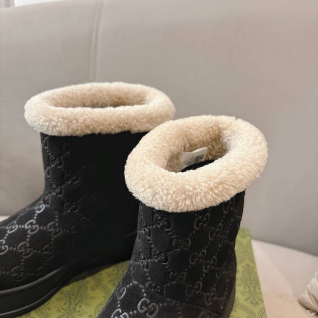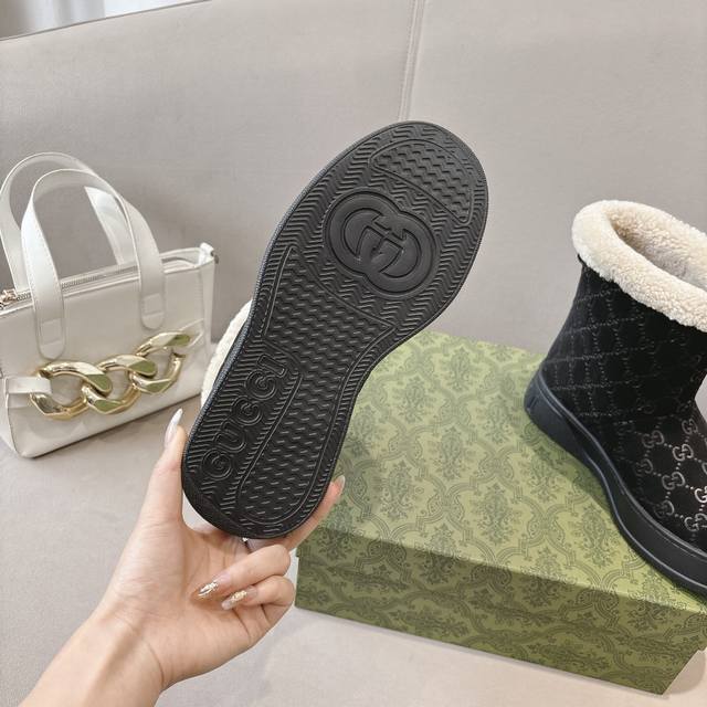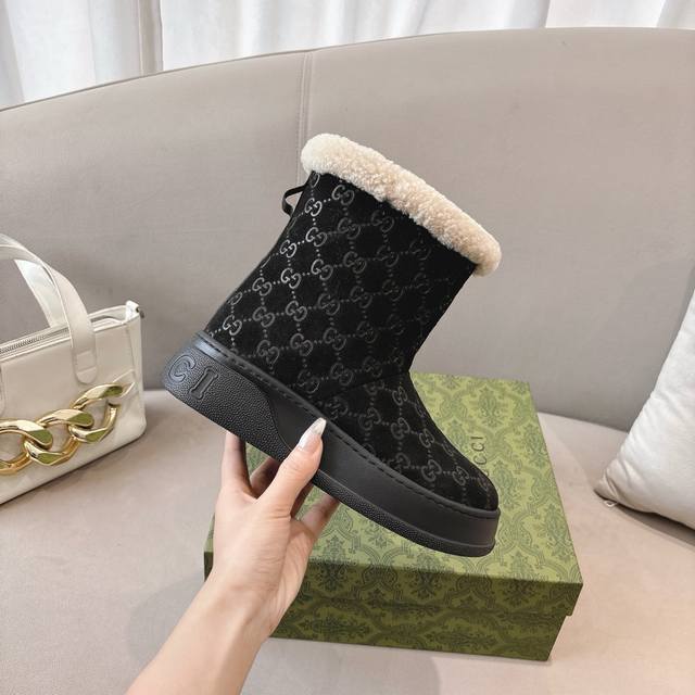 爆款 Gg 新款女士及踝靴羊毛靴这款 Cruise 靴子既稳定又奢华。Gg 图案和其他细节向品牌的根源致敬。 DDD 这款雪地靴鞋面采用牛皮反绒皮压纹Gg,内里羊毛一体,鞋垫采用塑料Q弹pu羊皮毛一体,脚感舒适又保暖,橡胶发泡大底防滑耐磨,码数35一42码, DDD