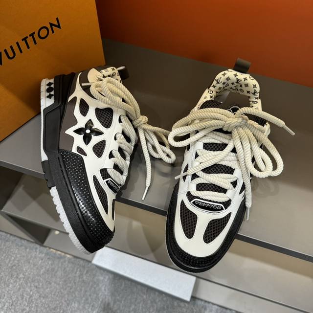 码数38-46 L*Skate 运动鞋,本款 L.V Skate 运动鞋拼接 Monogram 丹宁布和科技网格面料,搭配科技鞋带和橡胶外底,彰显 1990 年代的瞩目风范。加垫鞋领及鞋舌延续标志性元素,后者的 Lv Since 54 标识代表路易威登创立的 1854 年。Monogram 花卉点缀橡胶外底,采用头层牛皮拼接高科技织物面料制成,鞋头撞色橡胶包裹,网布内里棉垫脚,舒适性一如既往的达到极致,精品传承,品质至上,值得拥有
