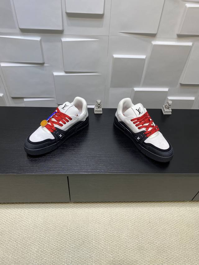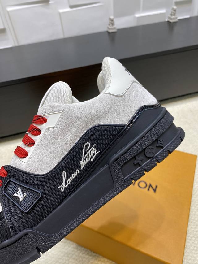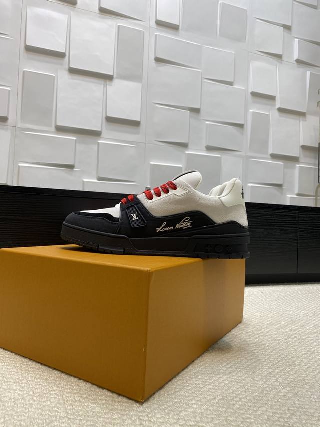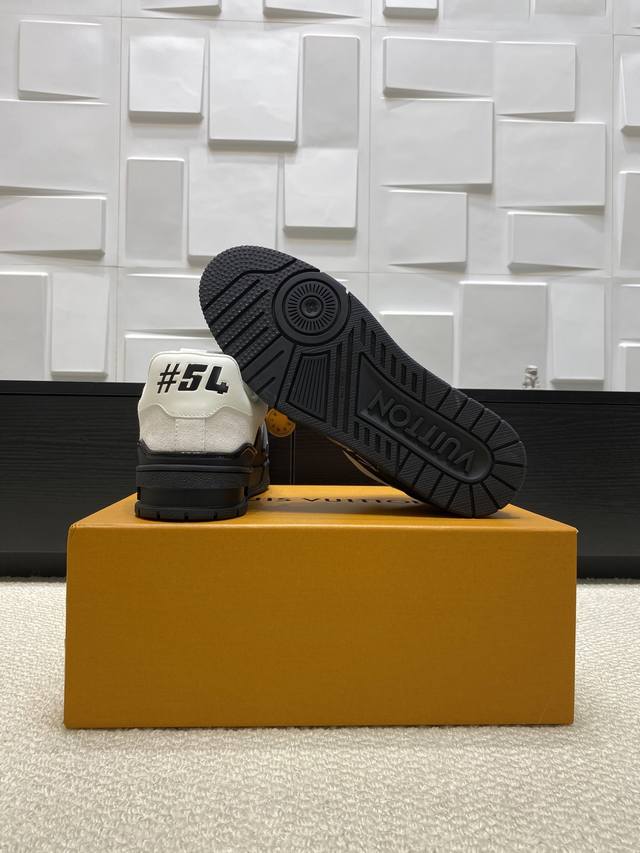 FFF 顶级版本: DDD 本款Lv Trainer 运动鞋以防水正绒面革与瞩目双色色调演绎新季风尚。缤纷登山风格鞋带与科技橡胶外底张扬户外精神,后者经改良强化抓地力。侧面手写体路易威登标识与后部#54字样彰显品牌格调 DDD Trainer 运动鞋,延续 Virgil Abloh 基于复古篮球鞋创作的经典设计。牛皮革鞋面融入 Craggy Monogram 压纹和路易威登标识,展现 Tyler 对 Monogram 图案和品牌元素的趣味重构 DDD 配送专柜精美包装 DDD 面料: 原版定制头层牛皮 D