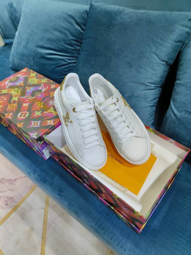 冲量价: 本款 Time Out 运动鞋选用柔软牛皮革,以耀目水晶刺绣点亮侧面 Lv 标识。3D Monogram 花卉绽放于加厚橡胶外底,铭纹孔眼再添精致细节。昼夜场合皆宜。