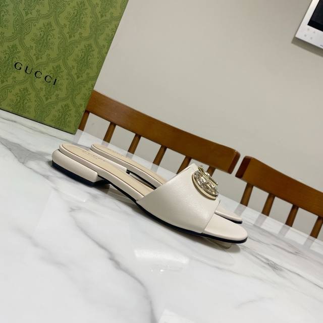 米白 Gucci 古奇 小圆头粗跟凉拖鞋,点钻双扣搭配,一贯的时尚.简约.大气.百搭 鞋面为混种羊皮,里垫为羊皮,真皮大底,原版开发五金饰扣 码数:35 40码