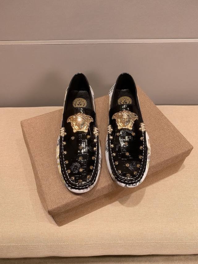 Versace 范思哲 官方旗舰店新款,米兰官方男时装周走秀款,进口牛皮面+金钉制作,超软质感,吸汗透气 ,鞋身马头像高级规则代表高级工艺标志,低调大方,上脚效果超赞,夜店撩妹神器!Size:37-45