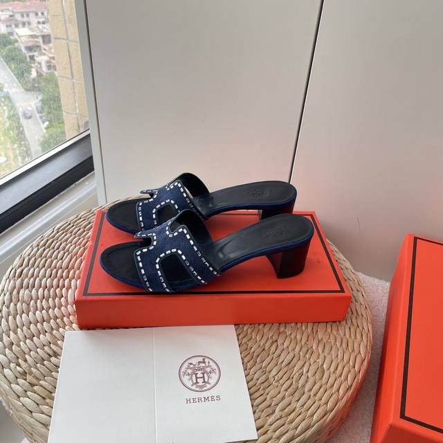 橙子出厂价p hermes 爱马仕 夏季经典粗跟H拖鞋 旅游度假沙滩凉拖 面料 水钻 跟高 4.5Cm 码数 35-42