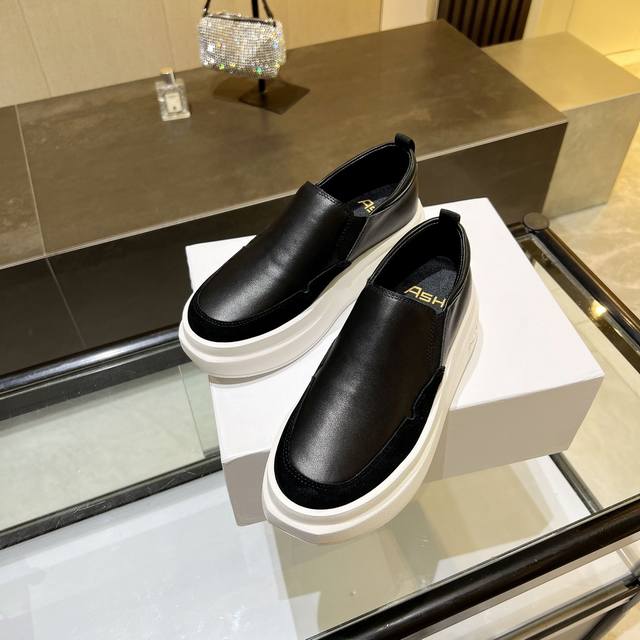 上新Ash 款号031 秋季明星同款 休闲系列,简约设计的松紧透气鞋身,搭配轻盈回弹增高鞋底。 面料:头层牛皮+牛反绒 鞋底:橡胶发泡大底 内里:羊皮 颜色:黑
