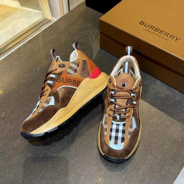 / 专柜最新高端版本,专柜一比一,巴宝莉23秋冬最新厚底运动鞋,采用复古格子、麂皮和皮革制成,搭配突出的弧形鞋底,鞋面:48%棉,52%小牛皮,衬里:60%聚酯纤维