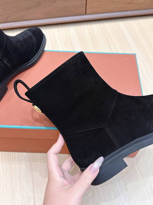 非常极简复古的款式,鞋面整体就是哑光牛皮面的简单制作,只有纯粹的牛皮质感,唯有靴筒上多了圆环金色,侧面拉链更隐形也更方便穿脱!内里也是采用牛里制作,耐磨又好穿~整体靴筒比较短,所以整体重量超级轻便!橡胶大底更柔软好走哦~