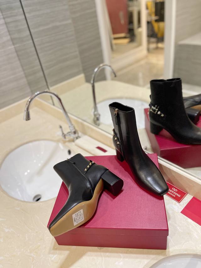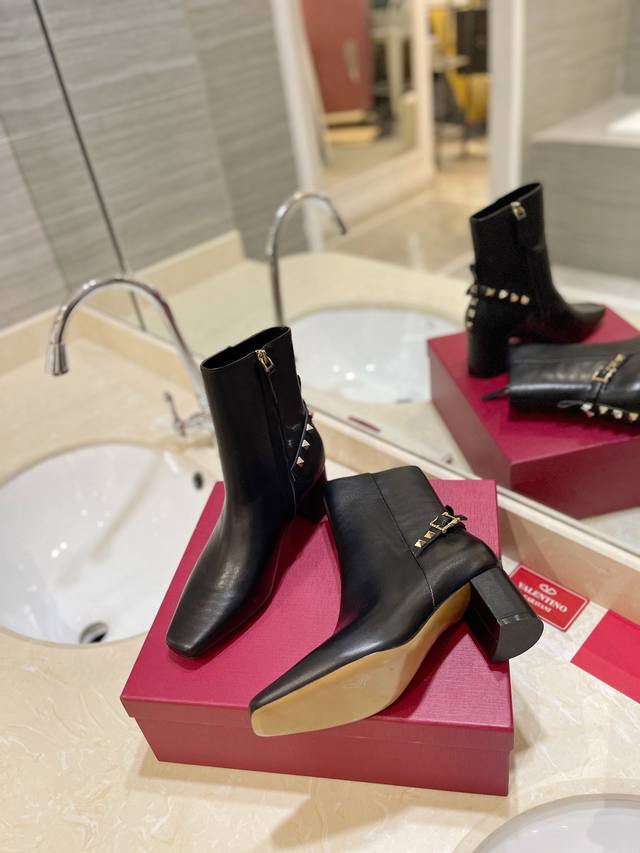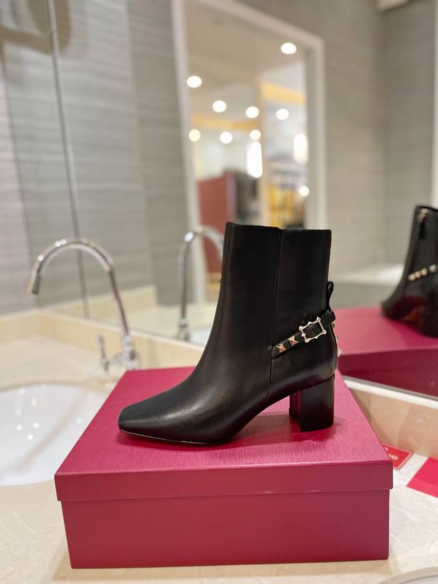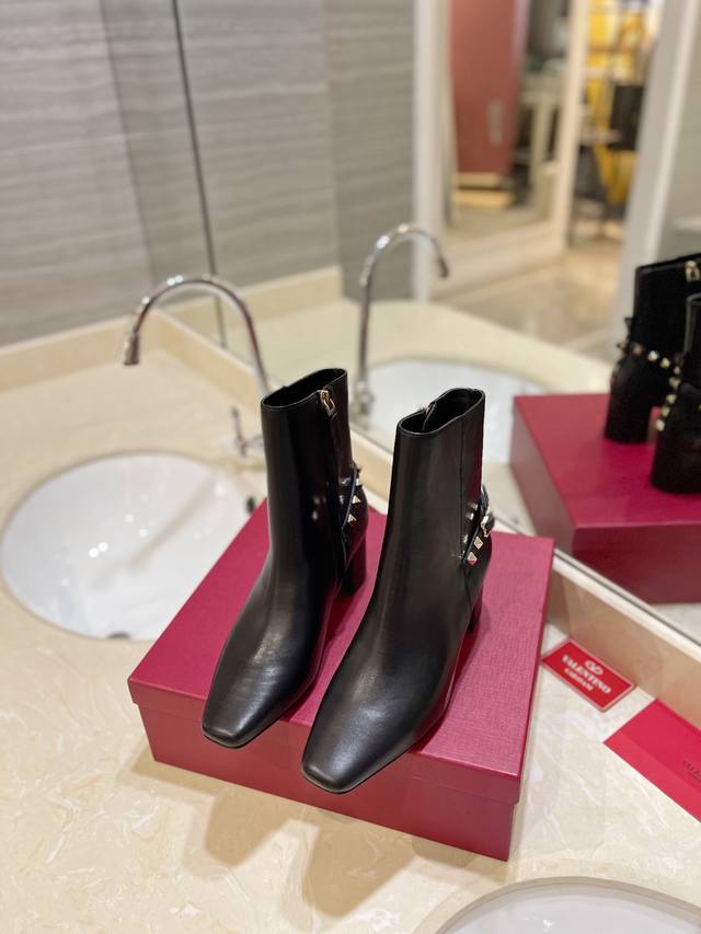 / 出厂价Pp Rockstud小牛皮踝靴 -铆钉采用金属电镀饰面 -同色侧面拉链饰 -可调节牛皮饰带 -鞋跟高:6厘米 码数可选35-40 41不退不换 鞋面材质