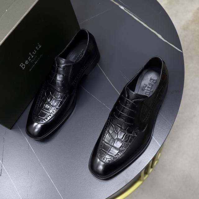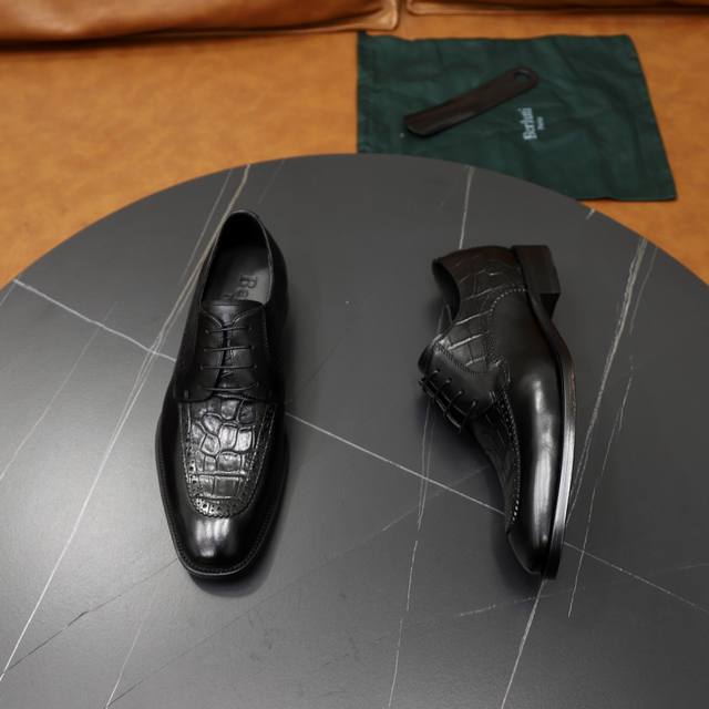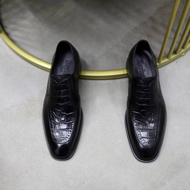 此款系带浅口鞋采用进口牛皮拼接手工制作而成 是一款具有历史意义的标志性鞋履,成为Berlut* 品牌的象征以及对其不妥协风格的最纯粹表达 意大利进口牛皮手工擦色 布洛克冲孔压边拼接鳄鱼纹牛皮造型 波浪形饰边 冲孔双侧压边走线 流畅形线条 内里黑色水染小牛皮里 脚感亲肤细腻 意大利真皮大底 增强舒适度