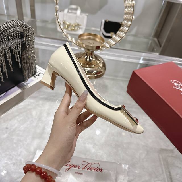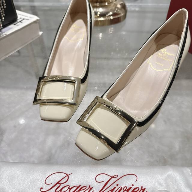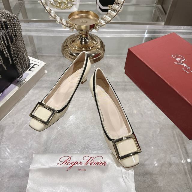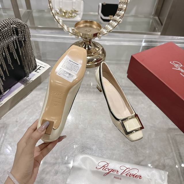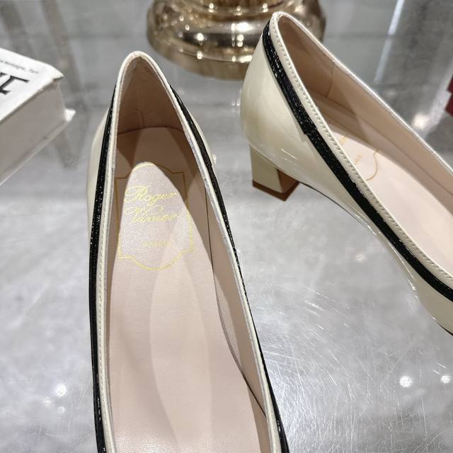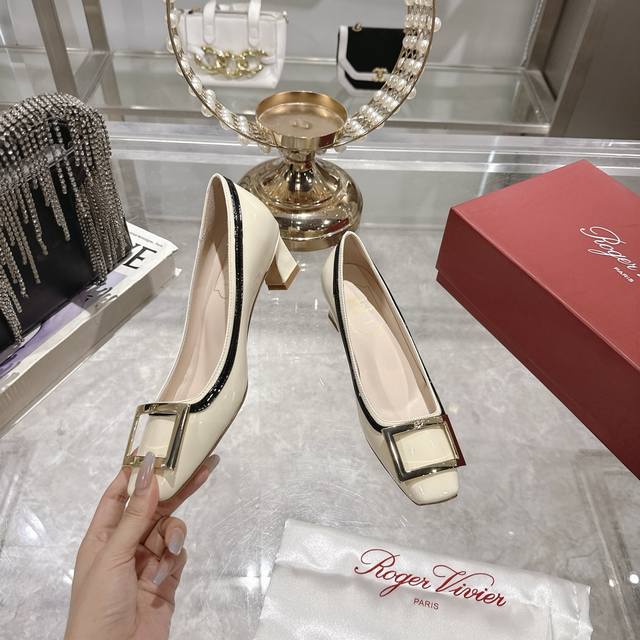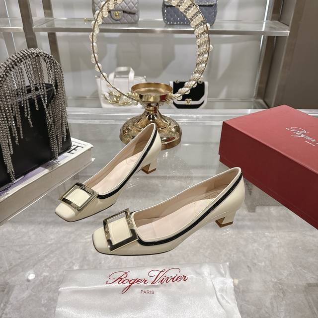 Rv女鞋鞋Trompett中跟粗跟方扣方头拼色单鞋女鞋. 本款单鞋百搭舒适.搭配金属方扣. 经典而不失创新. 倾斜的鞋跟为Trmpette增添无穷魅力.