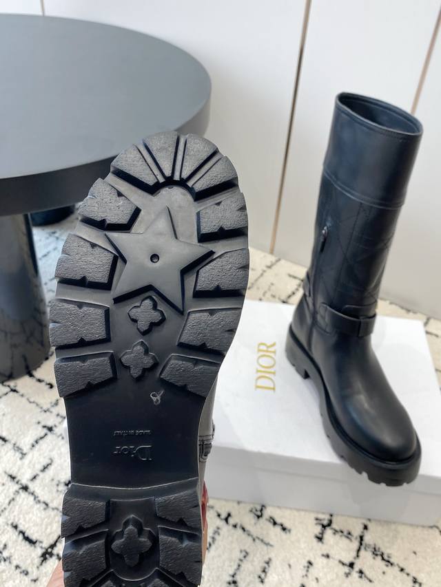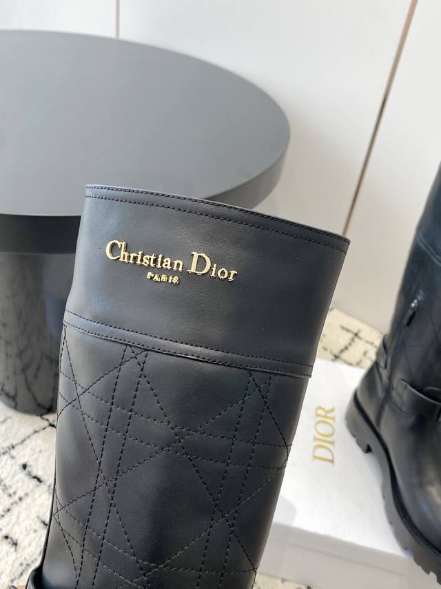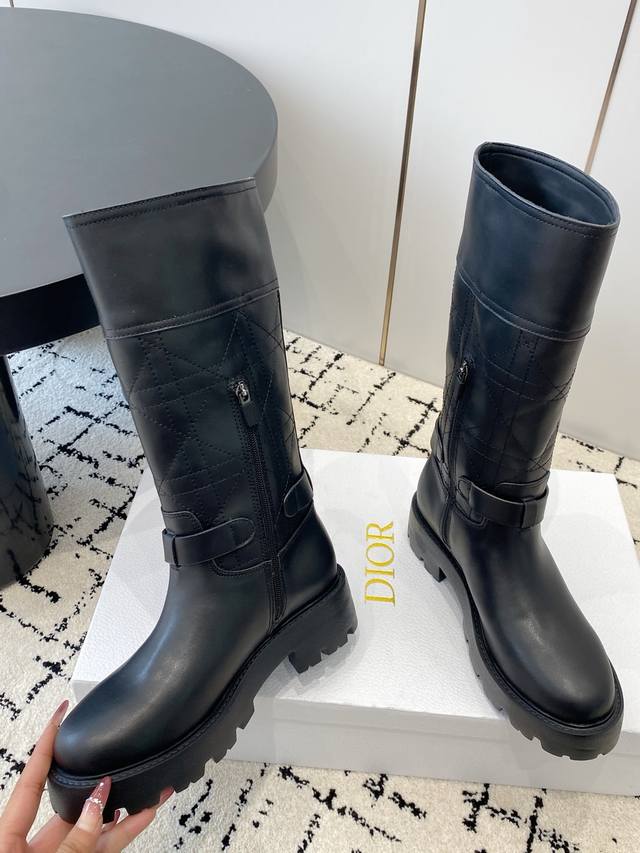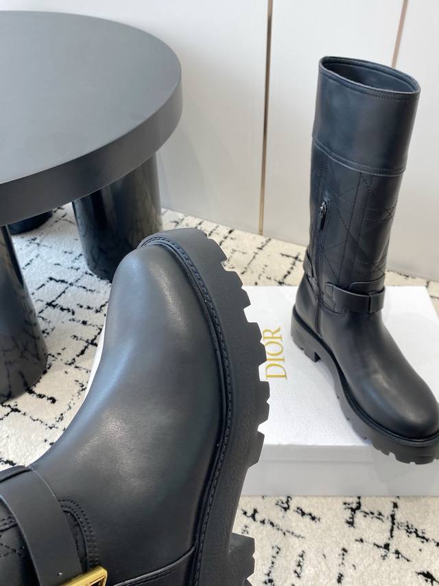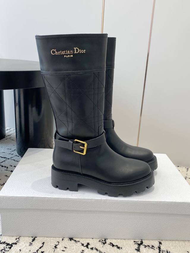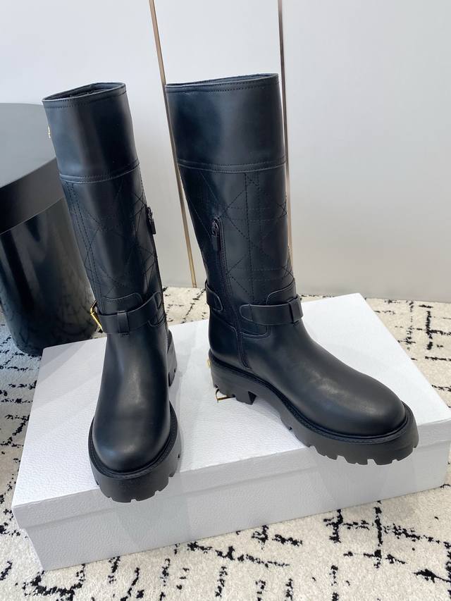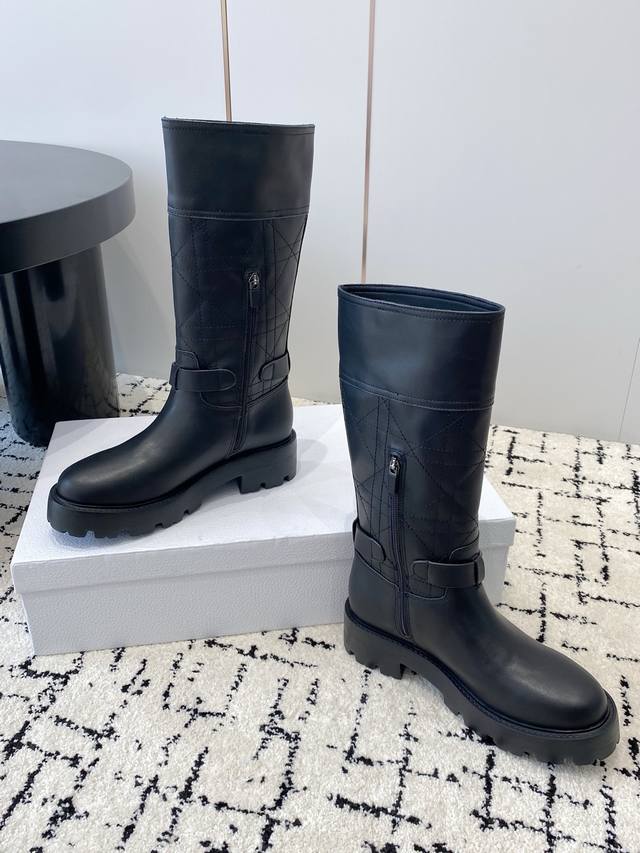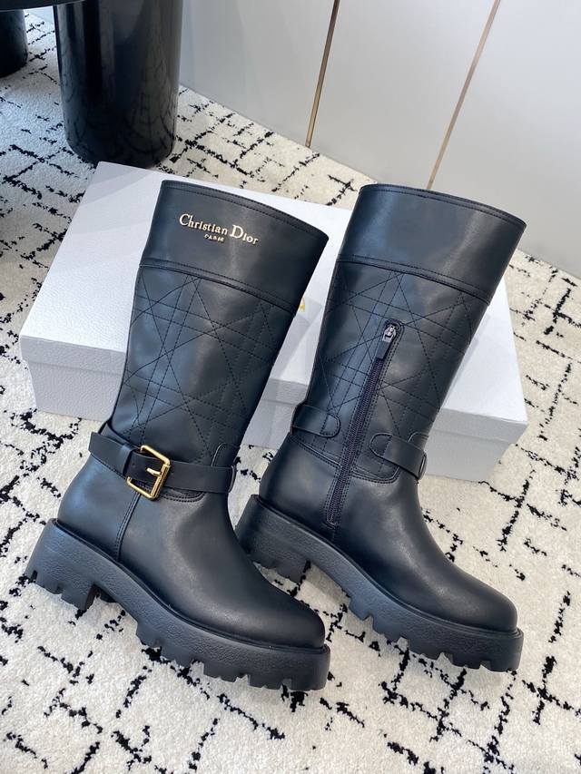 Dior 迪奥2025 秋冬新款D-Quest系列朋克风藤格纹电绣女靴 明星同款Cd字母Logo五金皮带扣机车靴 低跟厚底圆头一脚蹬骑士中筒靴
