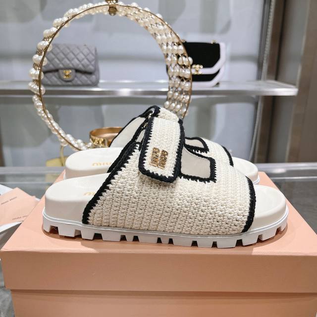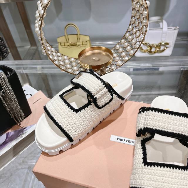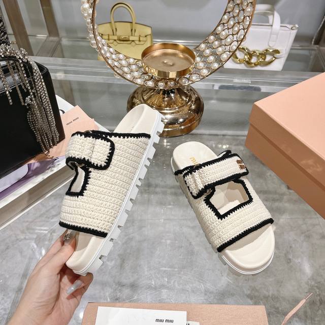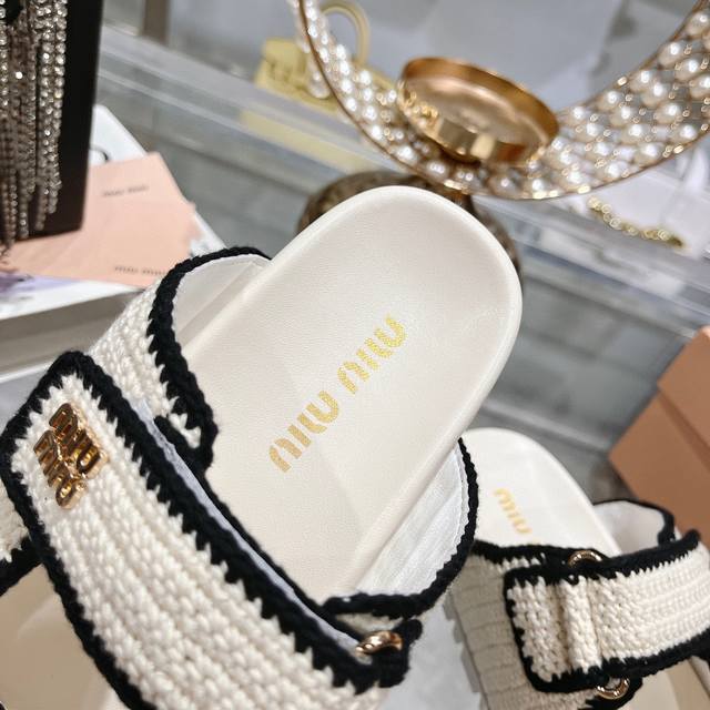 出厂 Miu Miu 两带 魔术贴 编织 厚底 平底 拖鞋 Miumiu 缪缪 25夏季新款拖鞋凉鞋系列