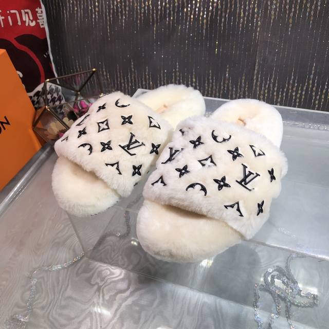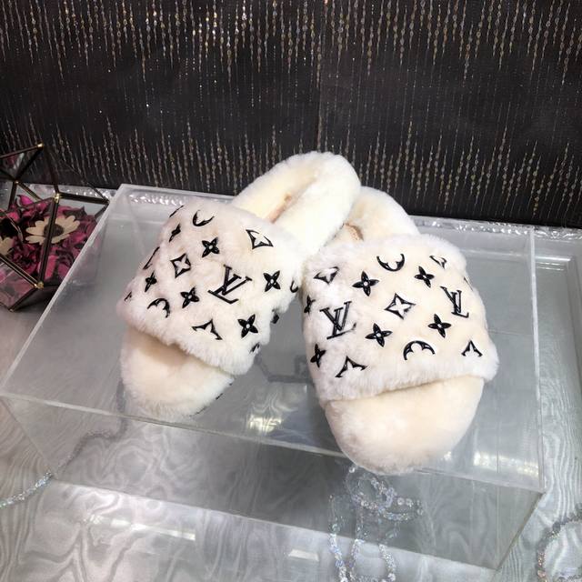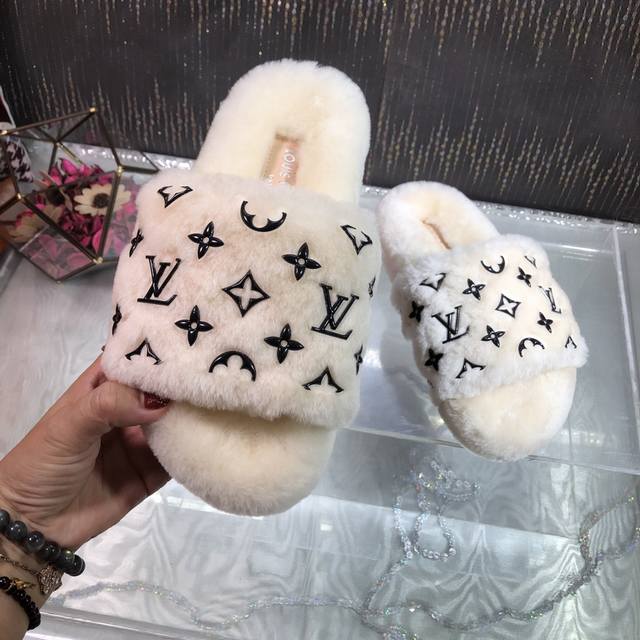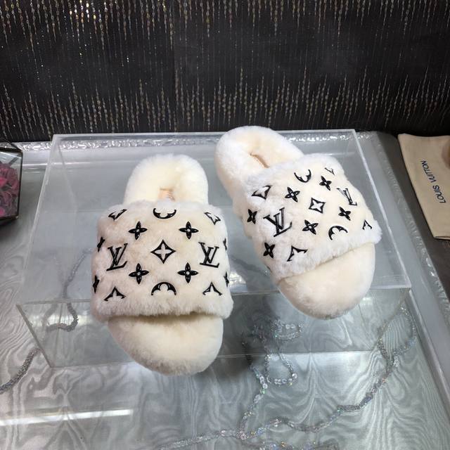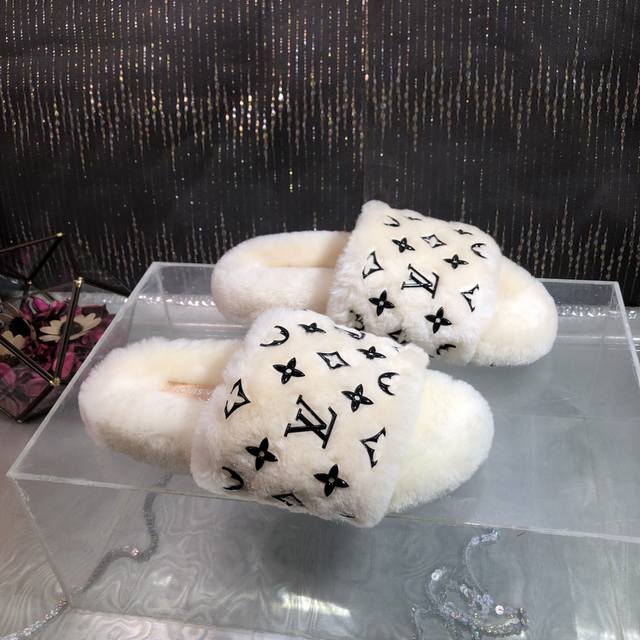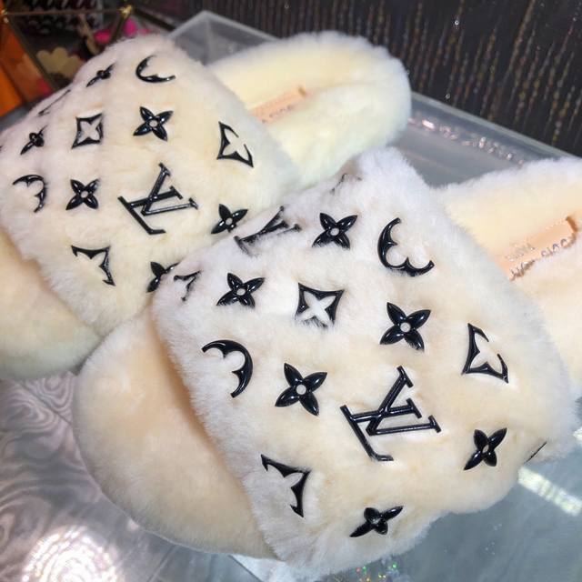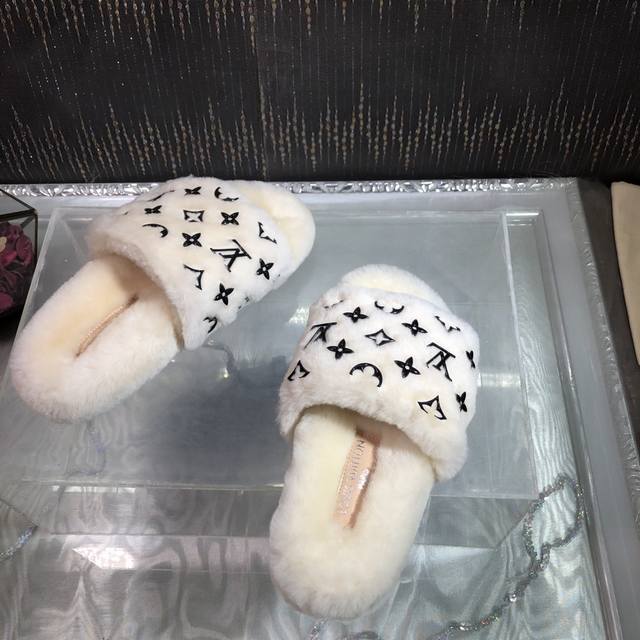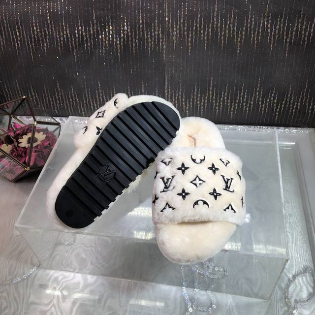 / 出 25Lv秋冬新品爆款老花羊毛拖! 鞋面羊皮立体压印Logo 高级又时髦!厚底上脚立显大长腿效果! 鞋面:羊毛压花 内里 垫脚:羊毛 大底:原版大底 鞋码:3
