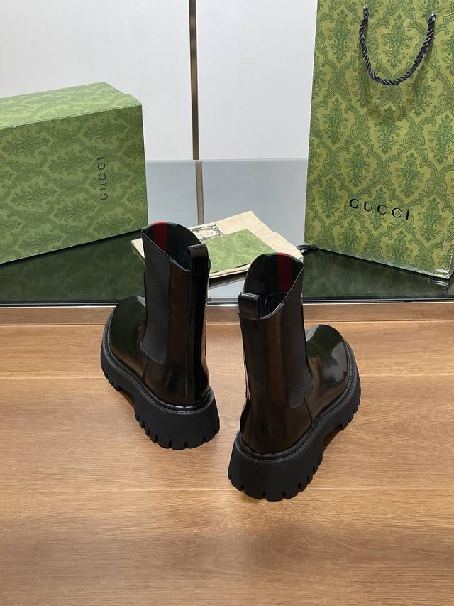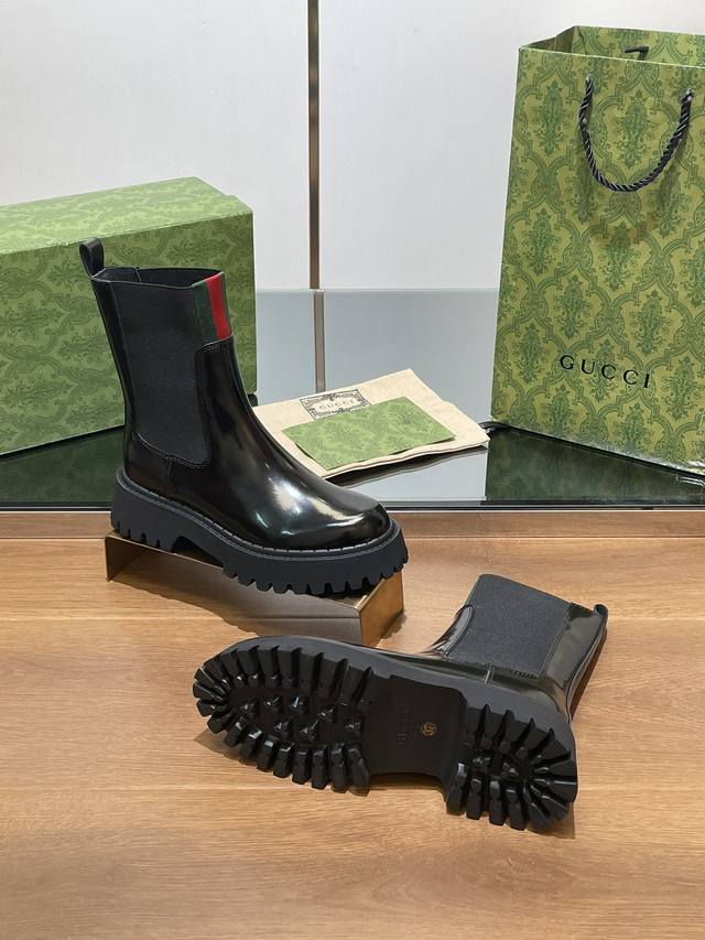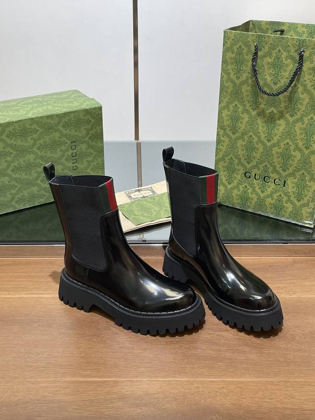 古奇新款秋冬最新Gucci 红绿织带橡筋松紧短靴沟纹厚底踝靴 切尔西靴烟管短靴代购级别 高端精品尖货