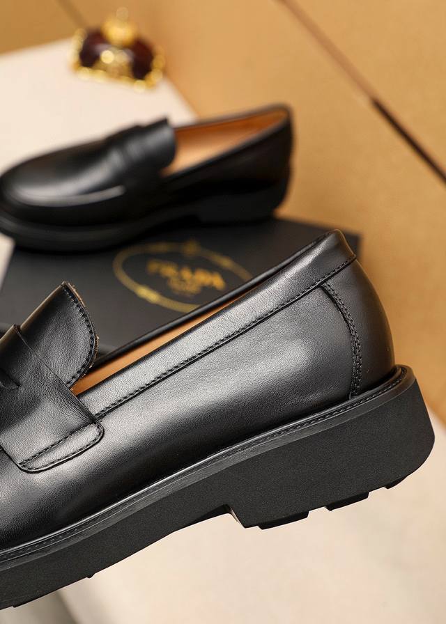 / 商品商标:Prada 普拉达 休闲皮鞋 正码码数: 39-44 38.45.46订制 商品材料:精选 进口头层小牛皮鞋面,进口水染牛皮内里。强烈立体视觉效果,发