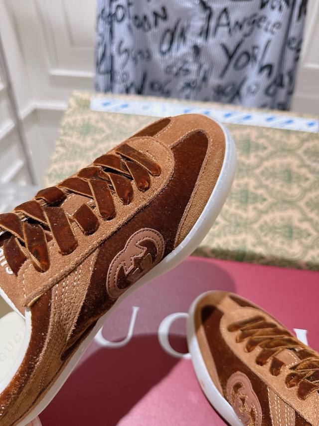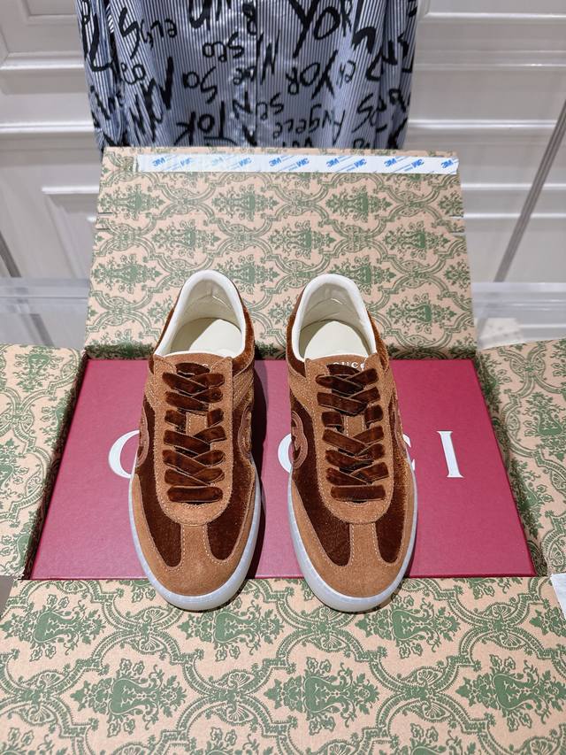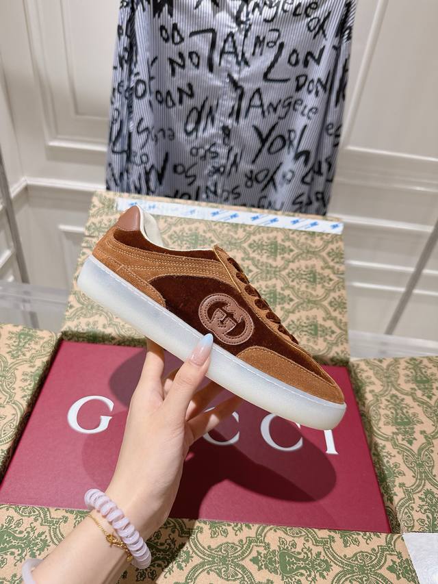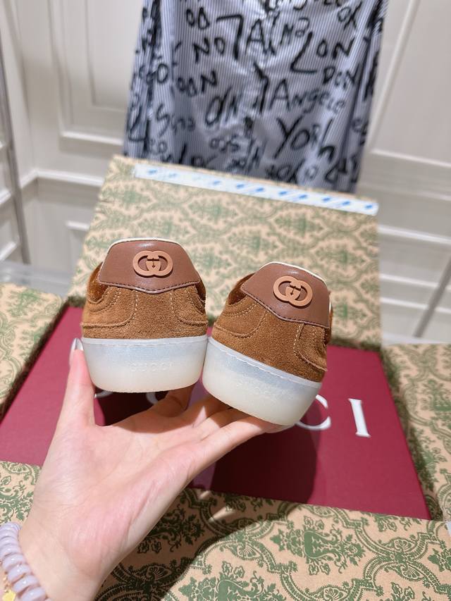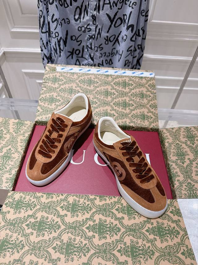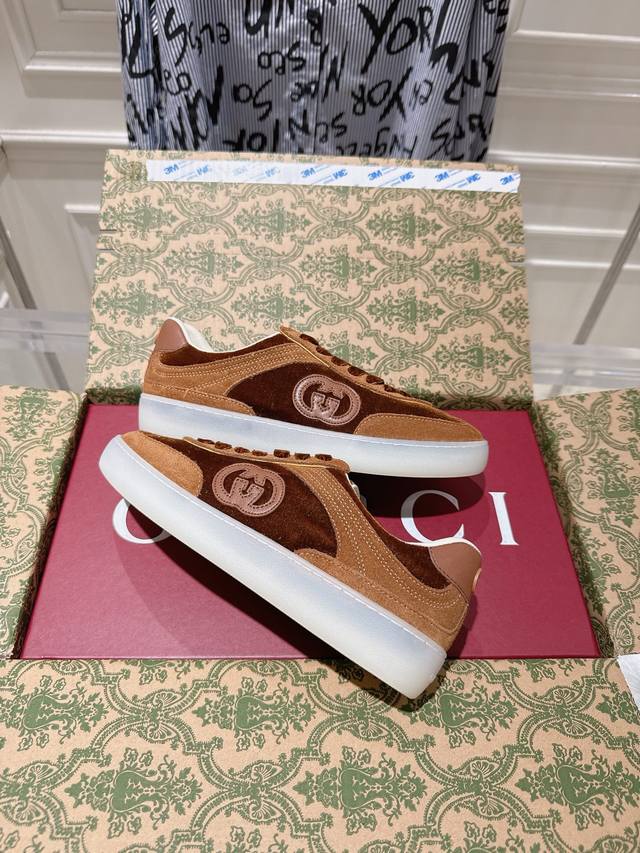 新款出货Gucci 2025 秋冬系列运动鞋灵感源自70年代复古篮球鞋,饰有Gucci标志性元素,例如互扣式双G标志。该款采用绒面革和皮革饰边。原版Tpu鞋底、原版面料、原版羊皮内里羊皮垫脚原版套楦工艺一比一折骨复刻!舒适追求极致!