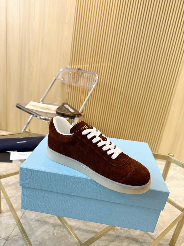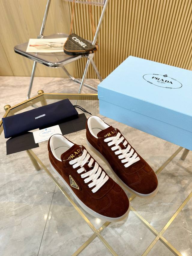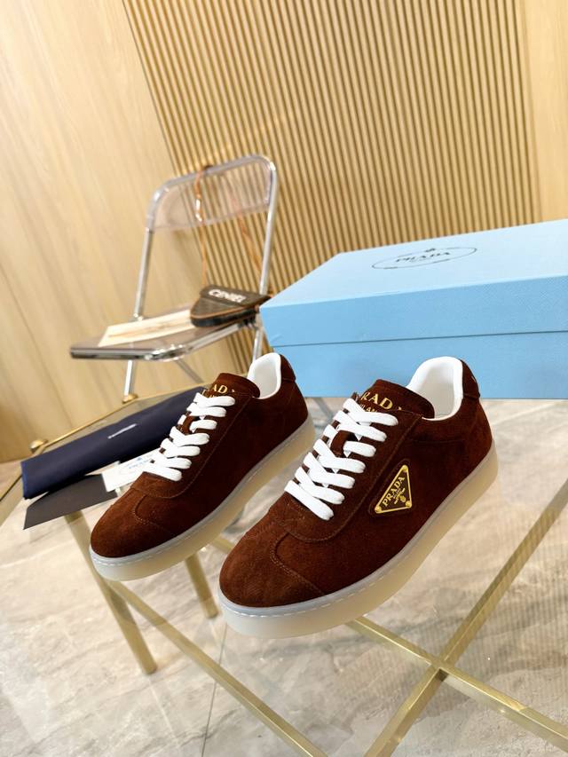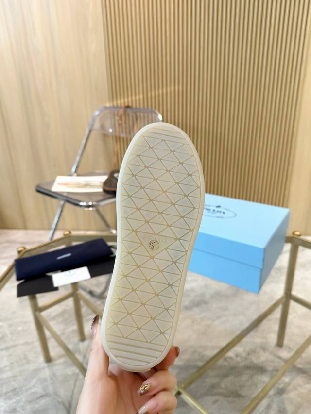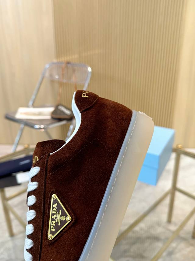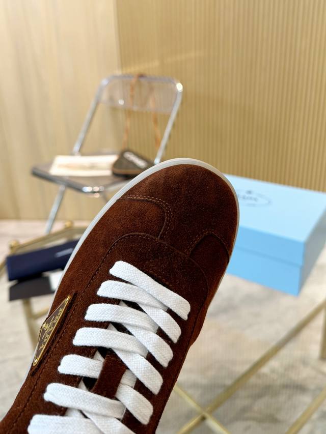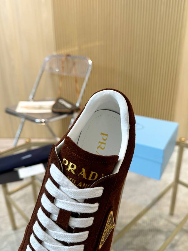 年Prada 普拉达女士金属徽标饰Lane鹿皮革运动鞋这款运动鞋时尚简洁,展现出极简风格和运动个性的充分融合。搭配经典的棉质鞋带和轻便的鞋底,涂珐琅三角形金属徽标增添别具一格的魅力。