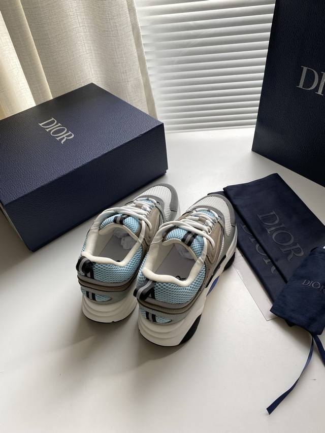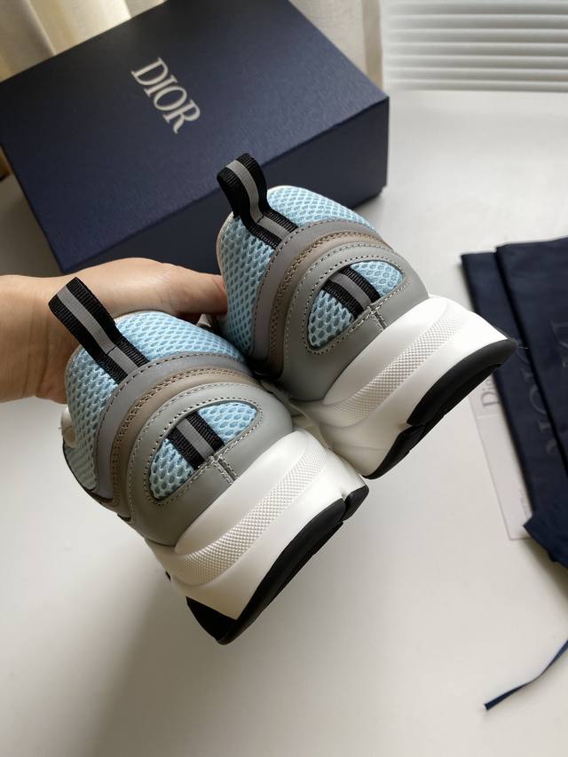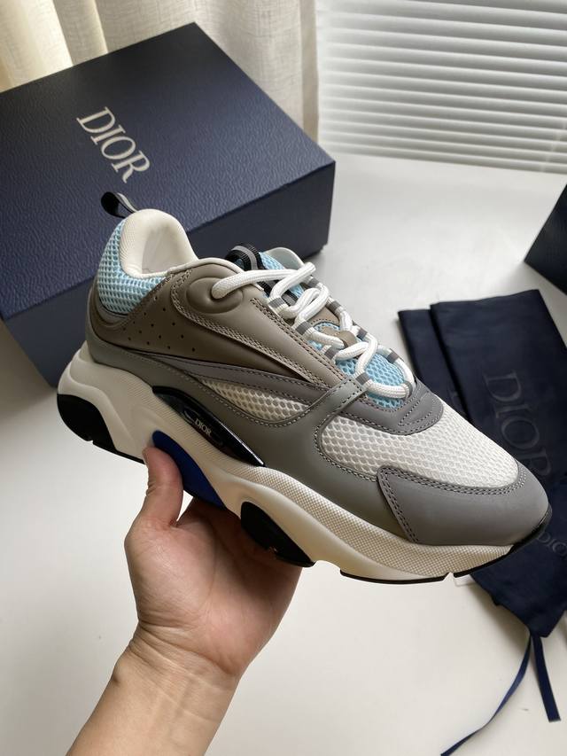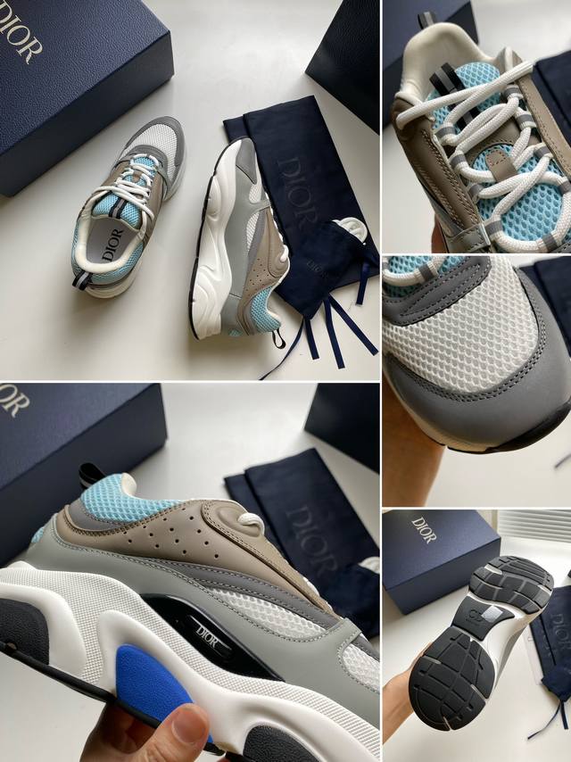 实价 新款 B22 运动鞋从复古跑步鞋款汲取灵感厚实的低帮轮廓采用灰色牛皮革以及蓝色和白色网眼织物拼接鞋面,搭配黑色、白色和蓝色的刻花橡胶鞋底。蓝色网眼织物鞋舌和鞋跟支撑采用尼龙丝带装饰,侧面饰以“Dio~”徽标。与西装搭配形成鲜明的对比,为您的外观添加运动服饰的时尚气息。厚底可增高4Cm左右~