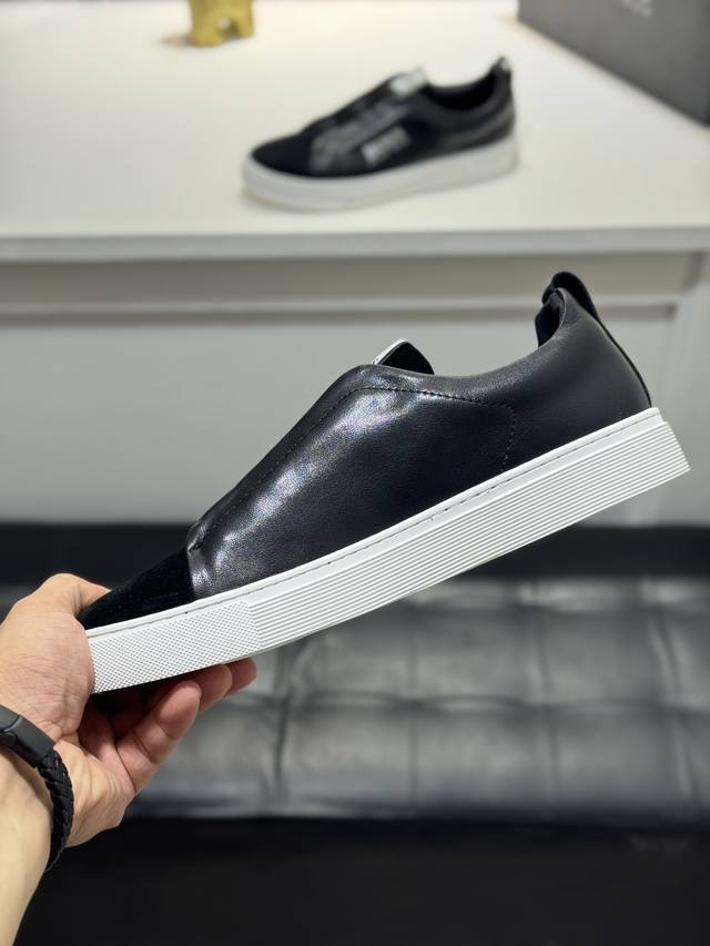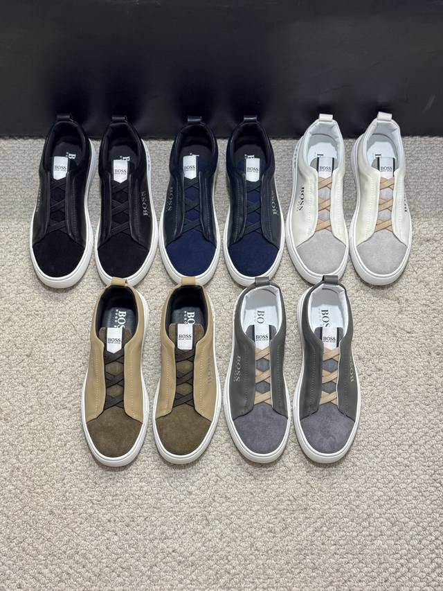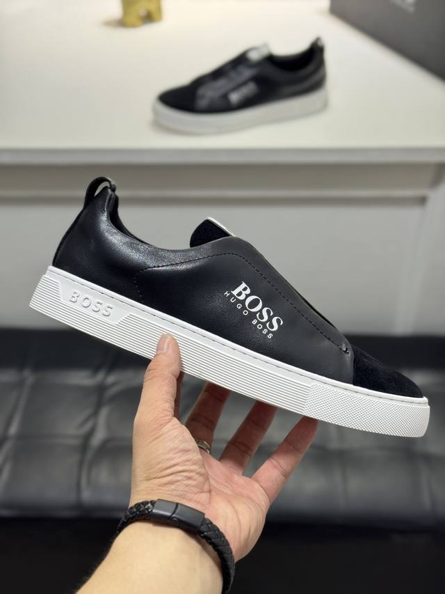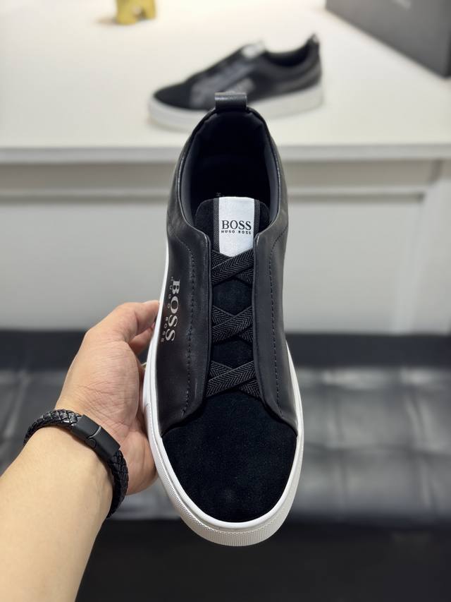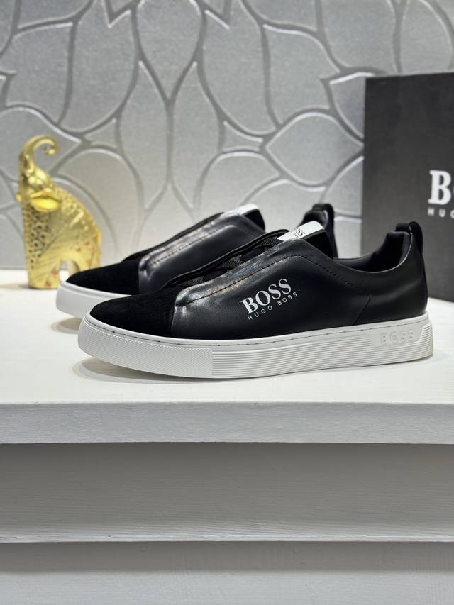 / 实价 男士精品 Boss 休闲男鞋,以经典的一脚蹬设计,成为永不落幕的时尚宠儿,经典的休闲造型。采用牛皮压纹,两边拉链设计,内里羊里品牌专用大底,橡胶耐磨超轻大