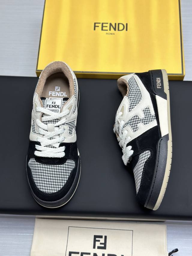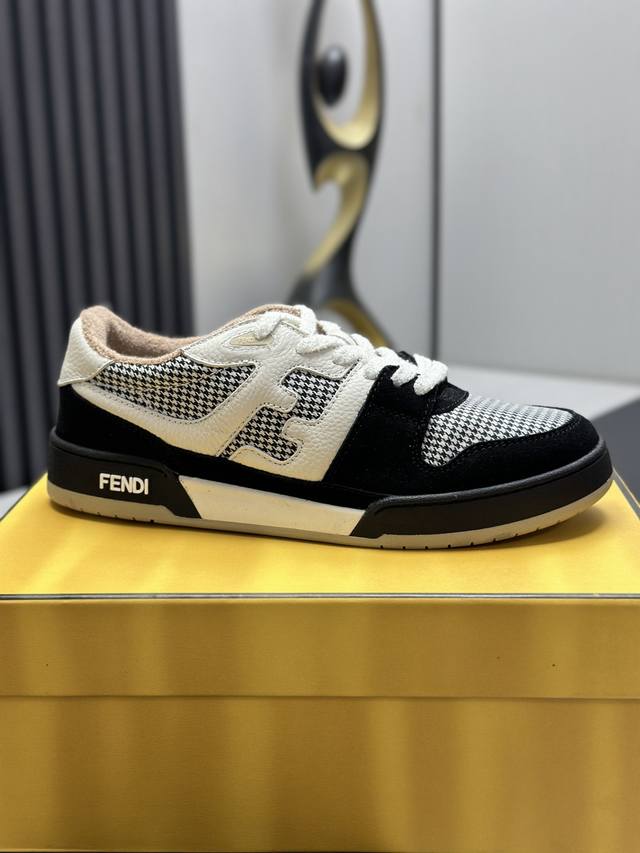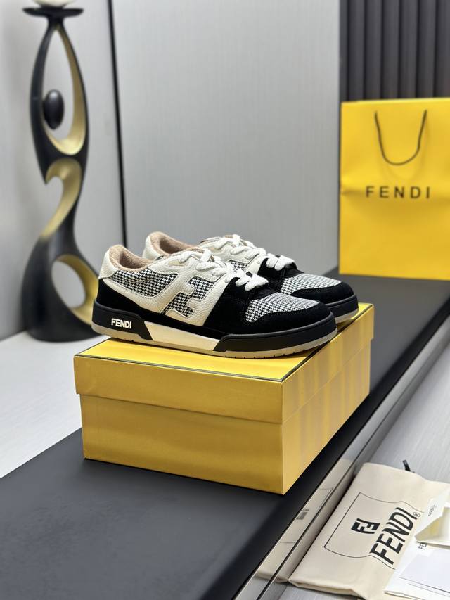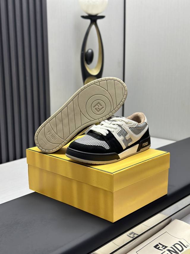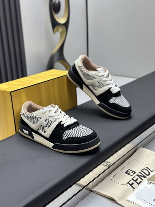 Fendi Match紧凑设计运动鞋, 鞋舌带复古标签,侧面饰有Ff图案缝线,鞋底Fendi字样压纹。白色麂皮和皮革材质。饰有同色系毛圈鞋口和鞋带。带米色减震材质的橡胶包覆鞋底。