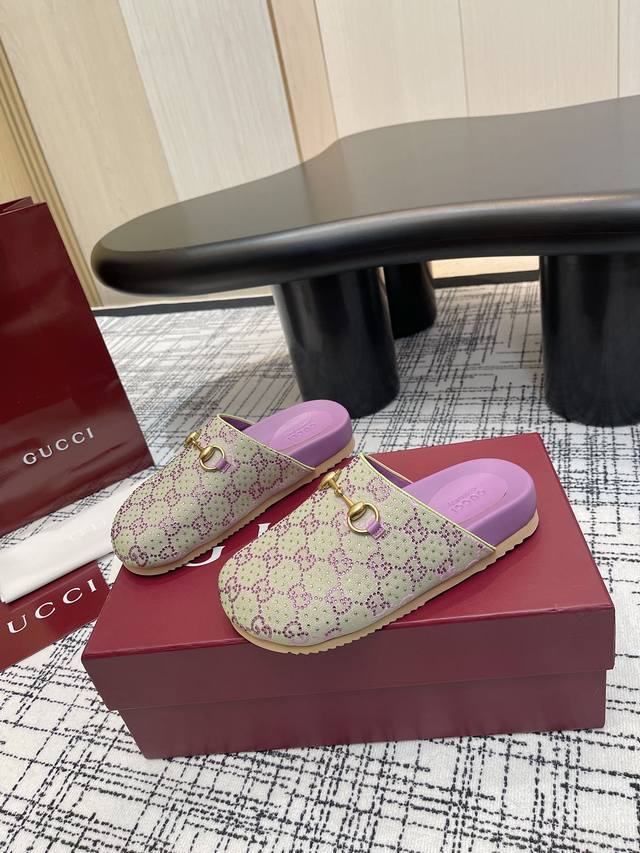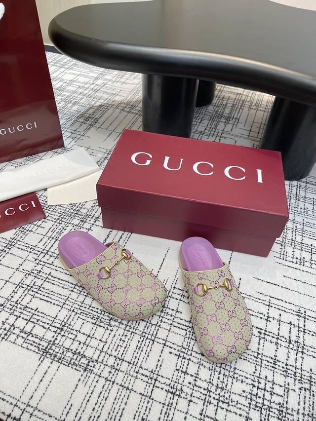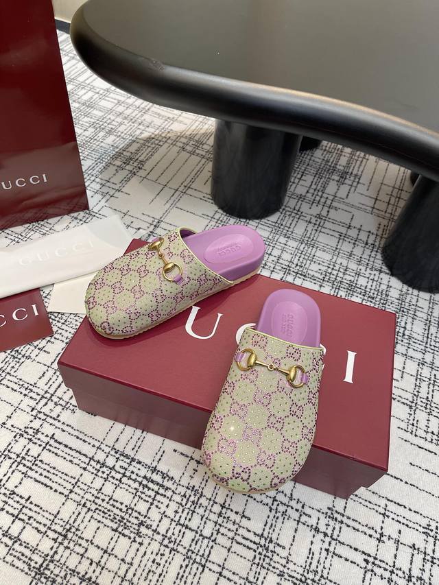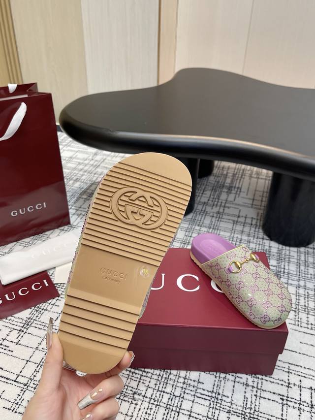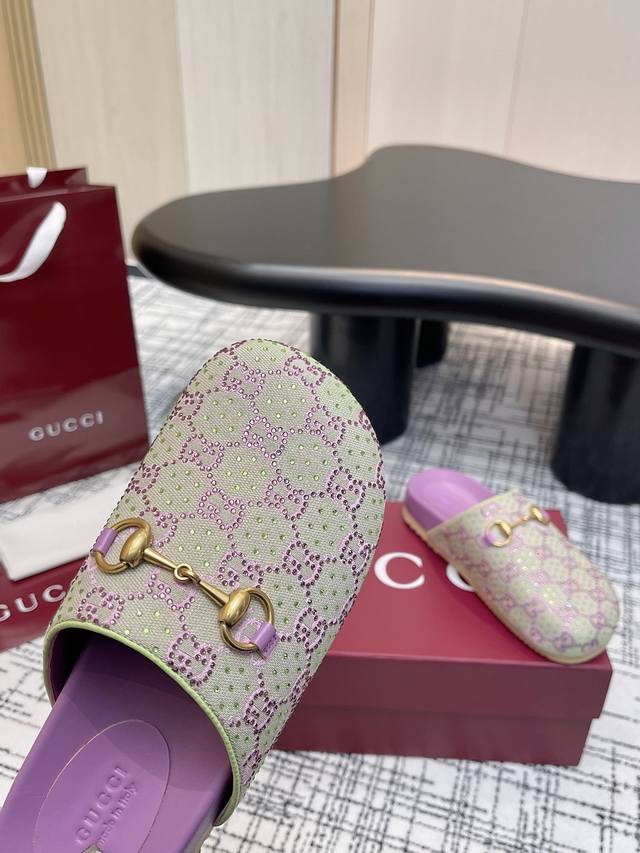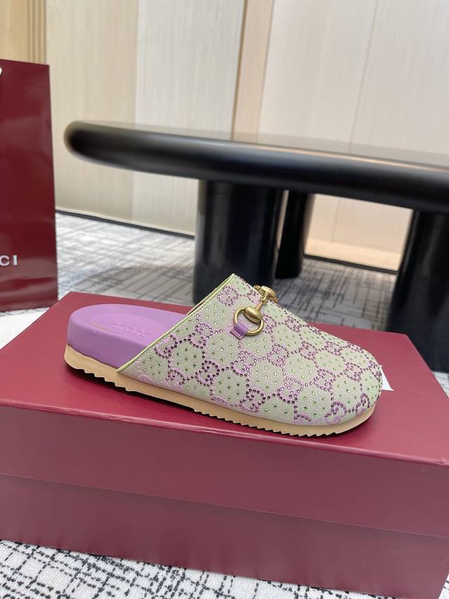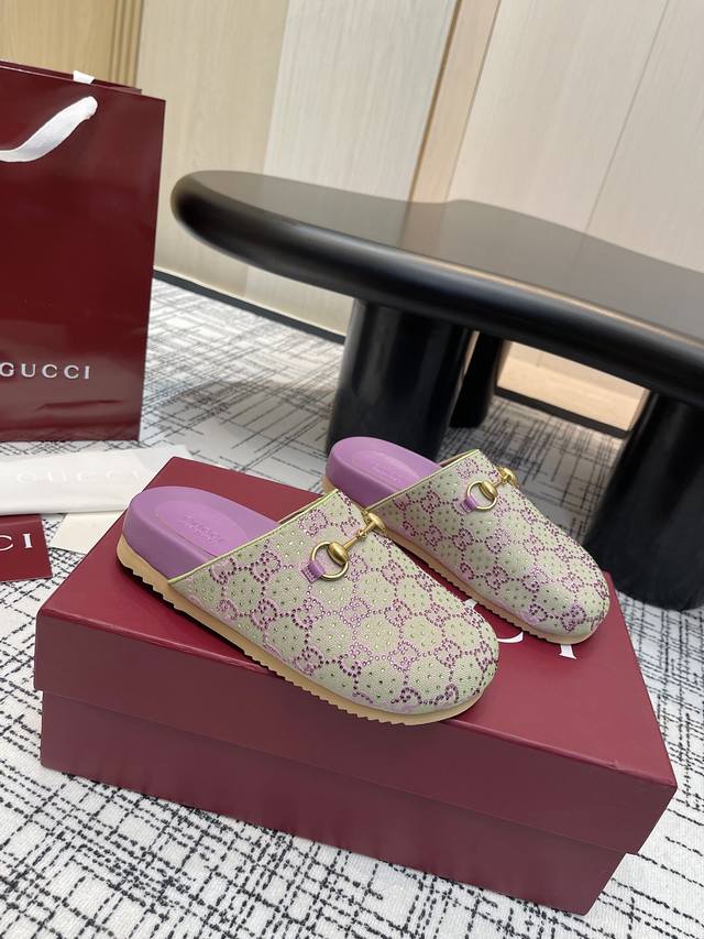 / 工厂P价 女装女鞋 运动原单 Gg 2025 早春马衔扣拖鞋穆勒鞋,澳洲混种羊皮内里。粉紫色老花+进口施洛华水钻 ,Pu增高水台!超轻量化,耐磨橡胶发泡鞋底女码