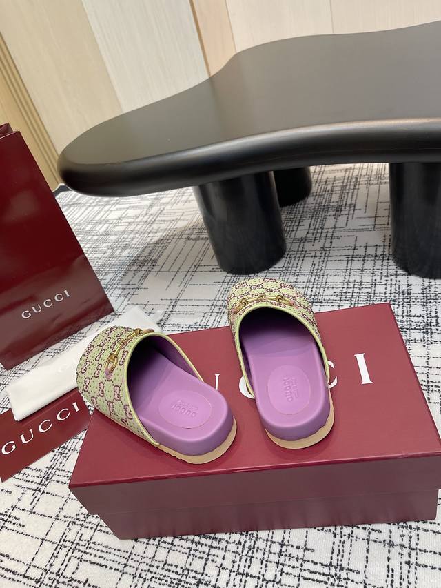 工厂P价 女装女鞋 运动原单 Gg 2025 早春马衔扣拖鞋穆勒鞋,澳洲混种羊皮内里。粉紫色老花+进口施洛华水钻 ,Pu增高水台!超轻量化,耐磨橡胶发泡鞋底女码35-41,全套包装