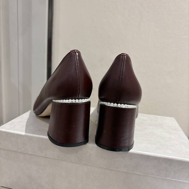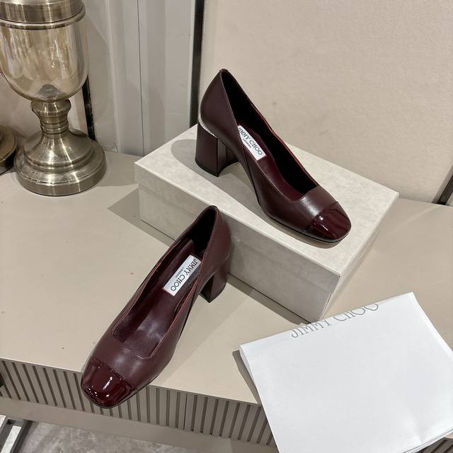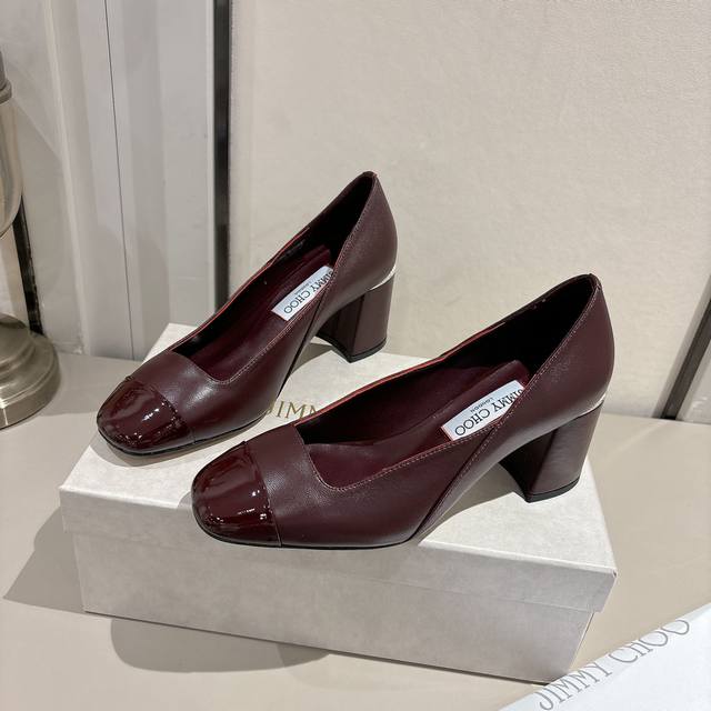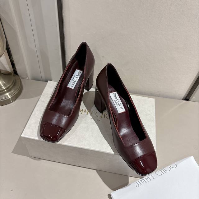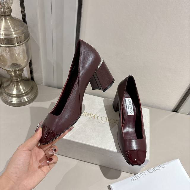经典传统高跟鞋型融入时髦个性亮眼设计。酒红羊皮鞋身拼车厘子红漆皮鞋头,配以珍珠镶嵌8.5厘米阔跟,抬衬职场干练造型或周末休闲穿搭时尚气质。