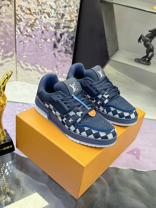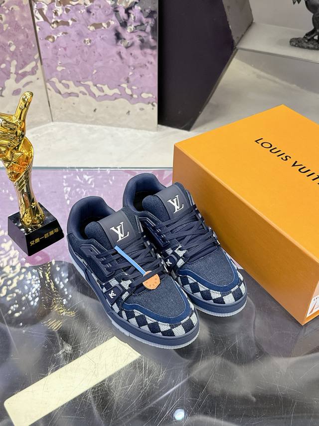 采用头层牛皮制成,进口定制专用印花牛仔布包裹,粗鞋带系带设计,侧面带 Monogram 大印花, 鞋舌及后跟”Lv 54“徽章点缀,