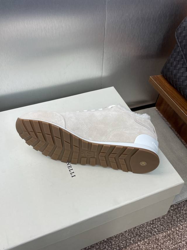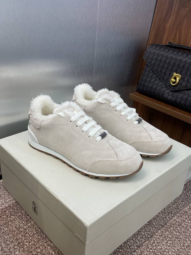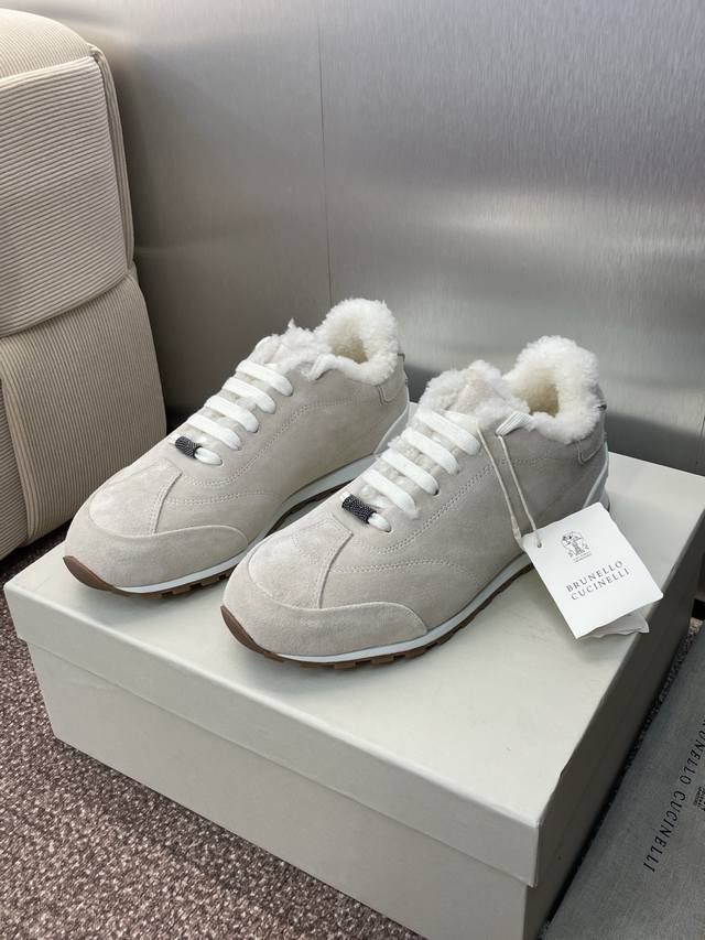 Brunello Cucinelli 2025秋冬新款拼色系带羊羔毛女鞋 Bc厚底圆头标志性串珠休闲运动老爹跑鞋