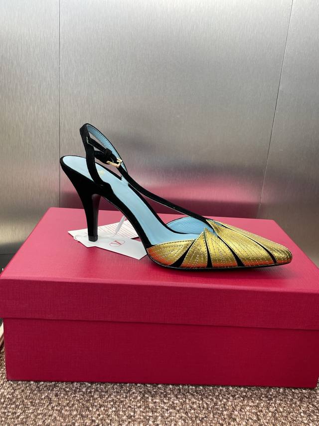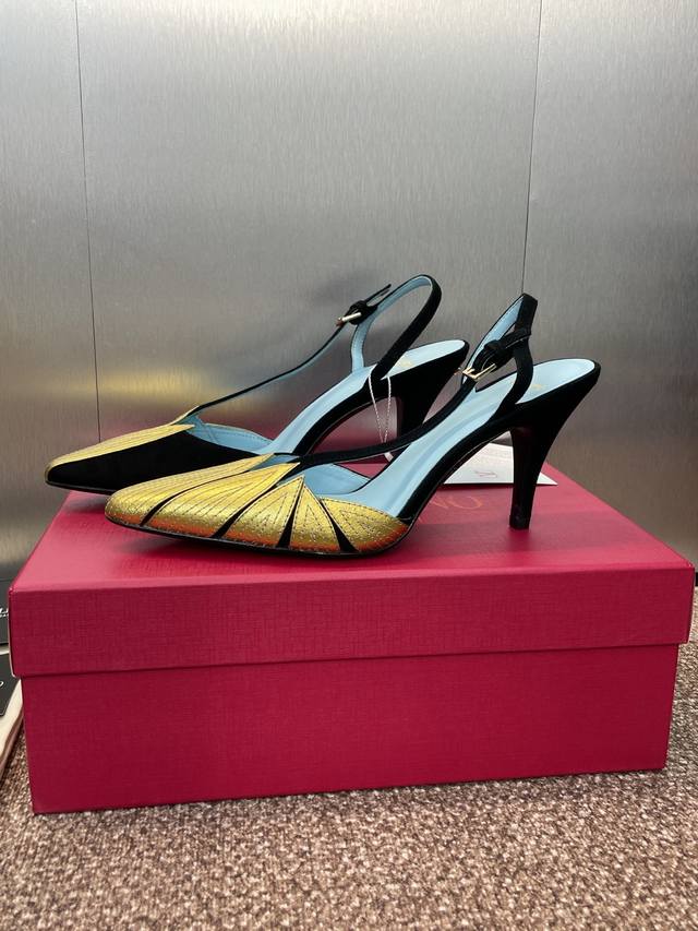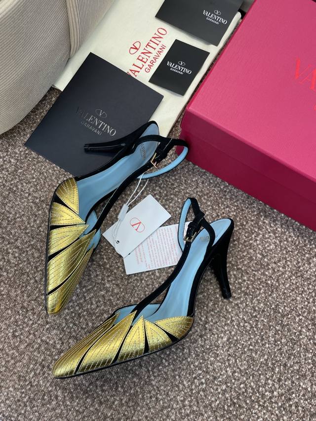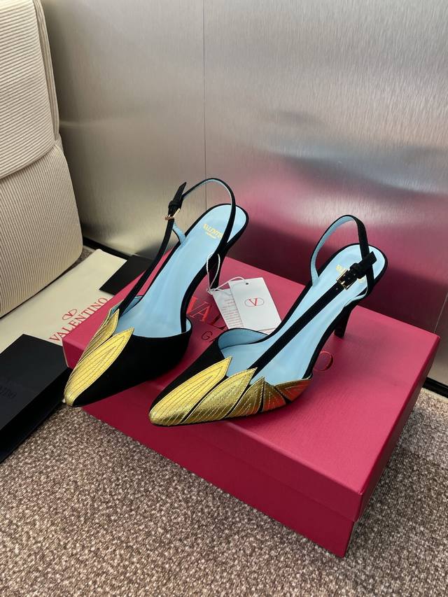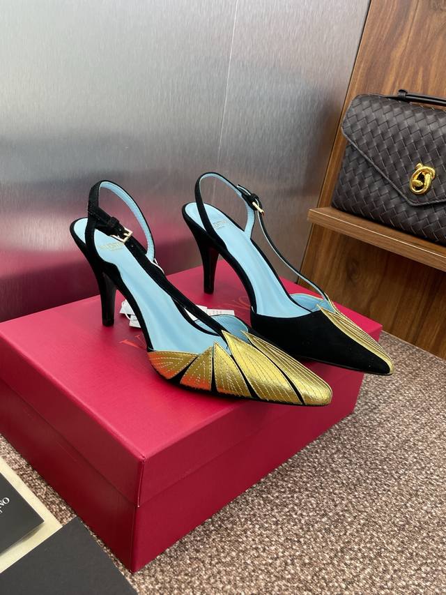 / 工厂P价P Valentino 2025春夏系列新款女鞋 华伦天奴高跟尖头电绣拼色后空凉拖鞋 材质:鞋面原版定制羊猄皮+水染羊皮内里+意大利真皮大底 跟高:8C