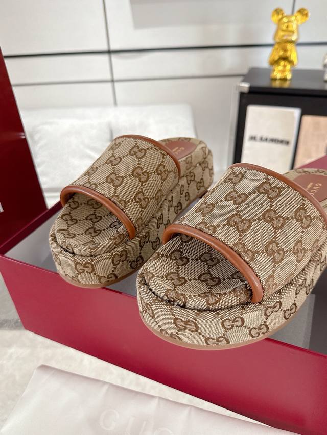 情侣款 Gucci 厚底经典Gg刺绣帆布拖鞋 拉腿增高神器 Yp一比一还原,所有细节 材质 舒适度 全部跟原版一样了 复刻度98%。码数:35-44