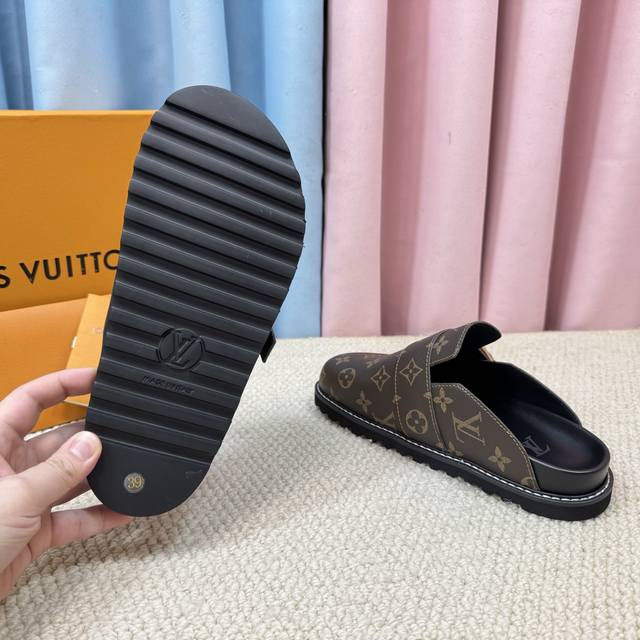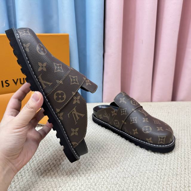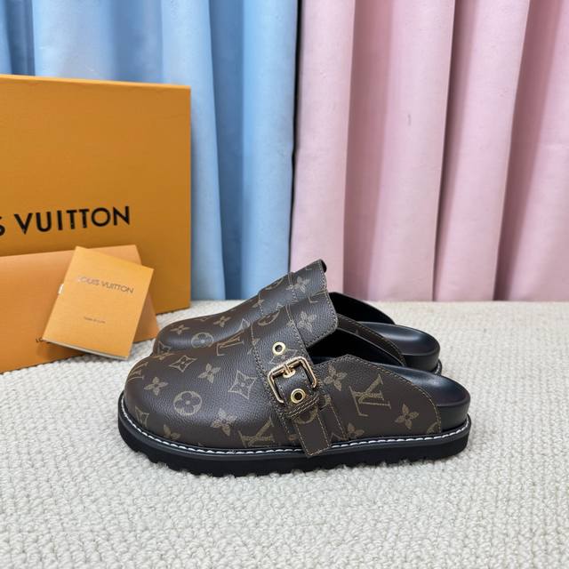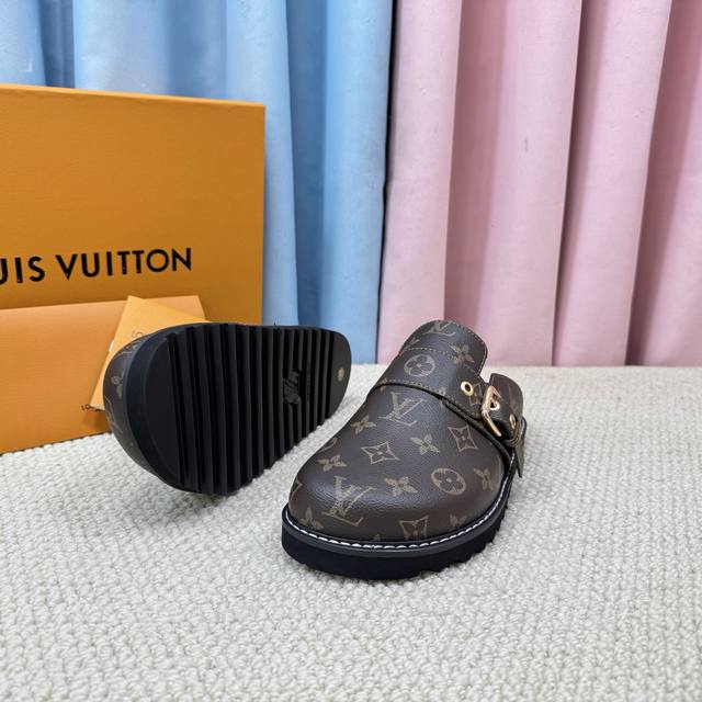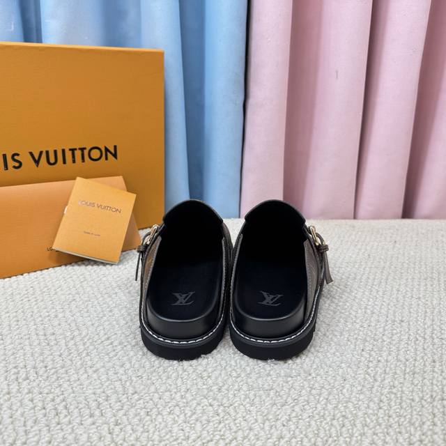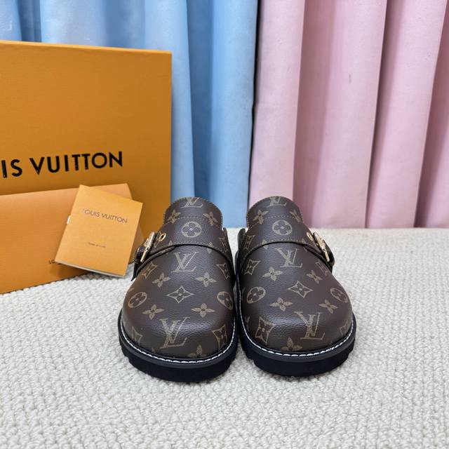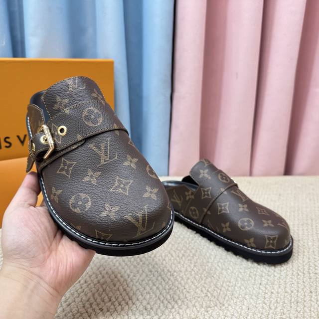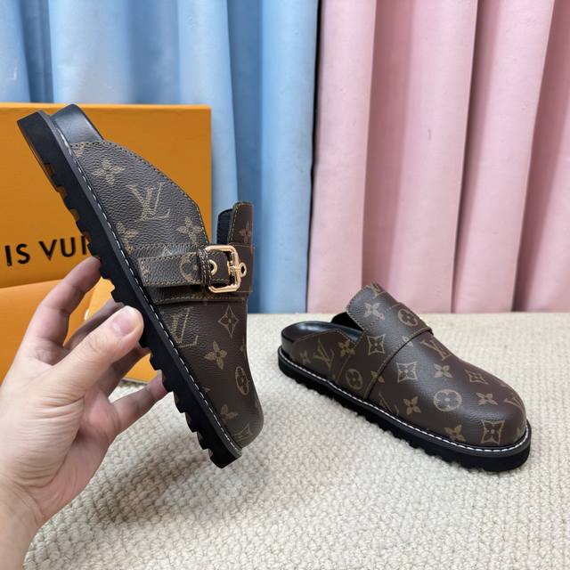 / 新款的 Lv 路易威登 早春新品 顶级版本 专柜主打最新款 拖鞋 猫跟拖鞋 硬货上新 鞋面:牛皮 粒面牛皮 牛仔布 内里:进口山羊皮里 跟高:平底 鞋码: 35