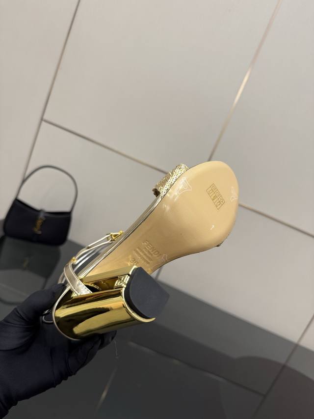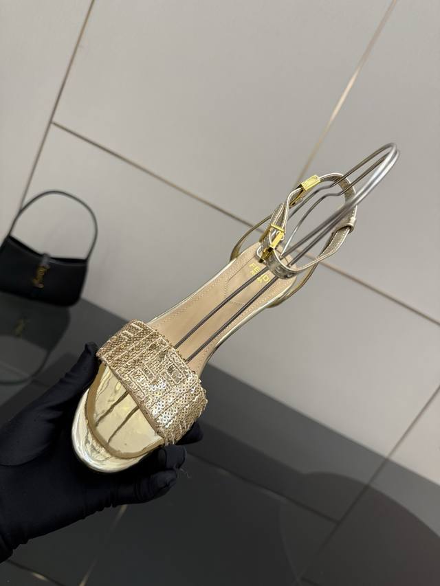 新款 芬迪 Delfina Ff亮片刺绣绑带高跟鞋凉鞋