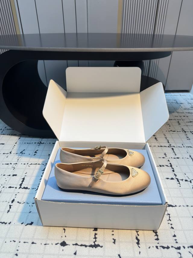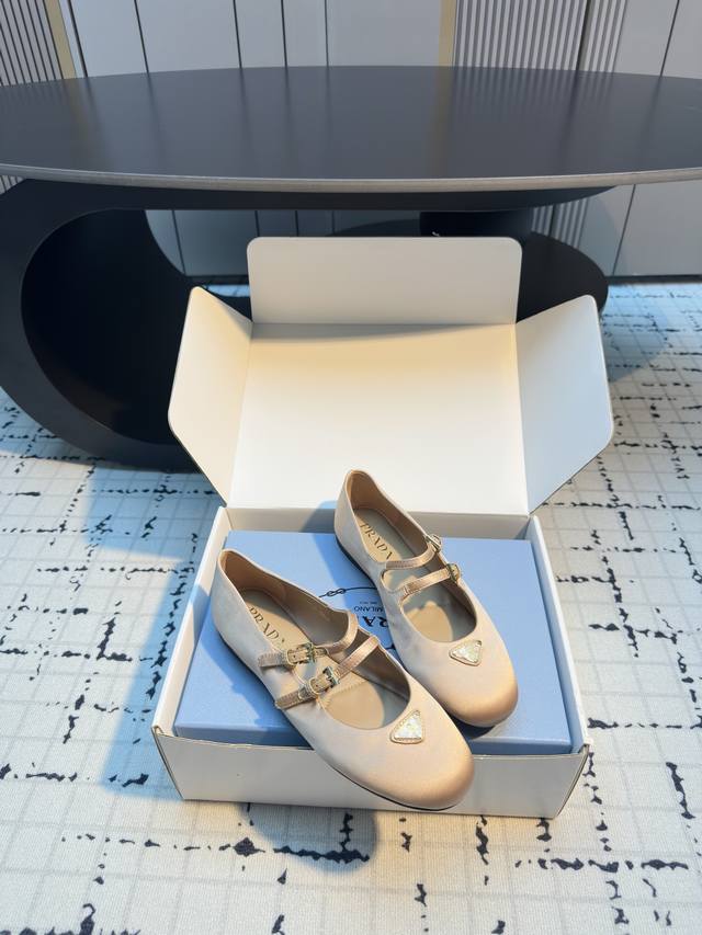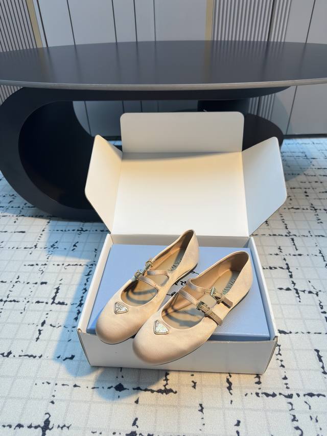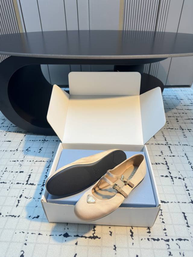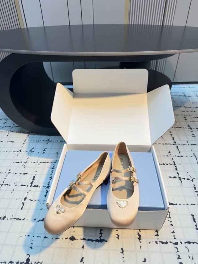 / 普拉达圆头玛丽珍芭蕾舞鞋 金属三角珐琅标点缀~圆头设计小巧又甜美!! 脚背上一字带设计~可自由调节舒适度!! 上脚秀气显白显脚小~包裹感非常好~无敌柔软舒适~超