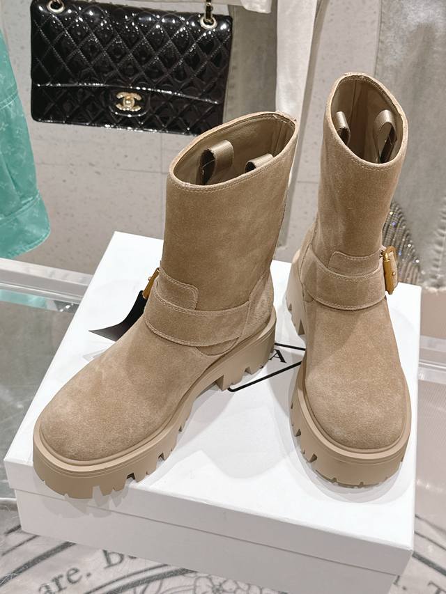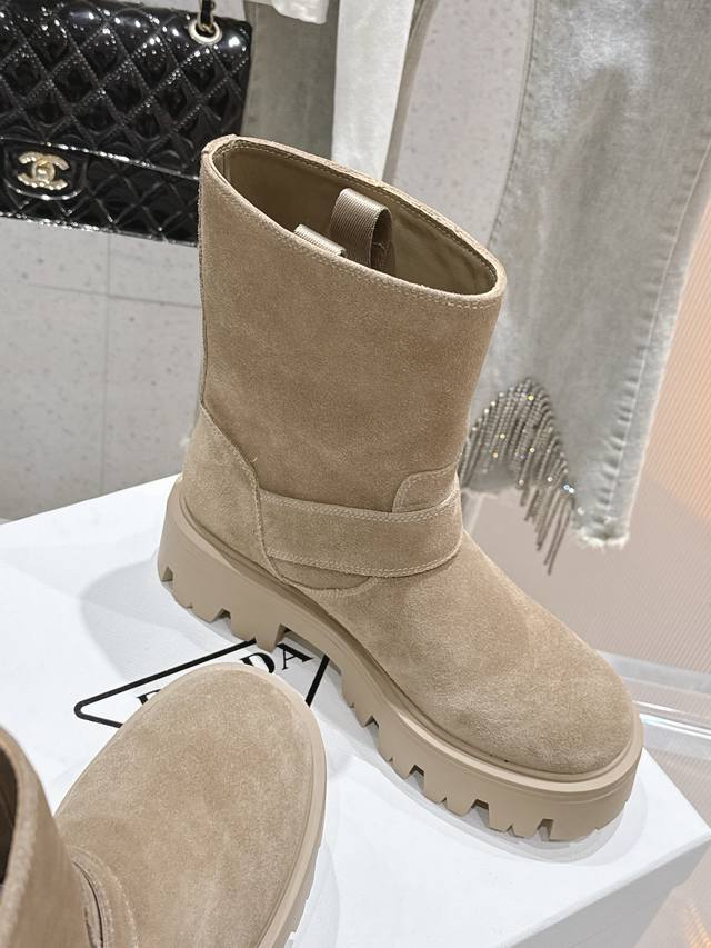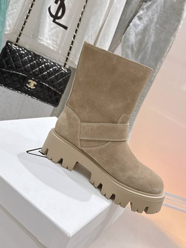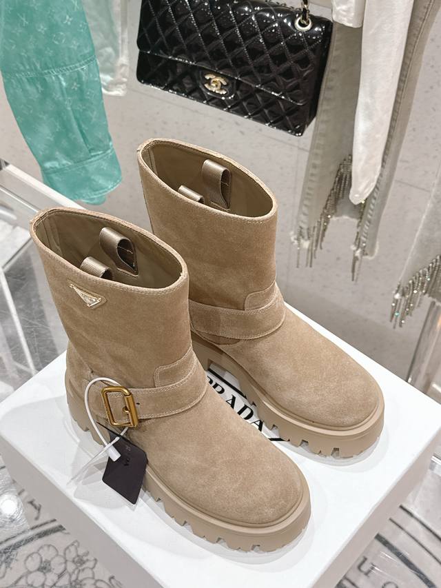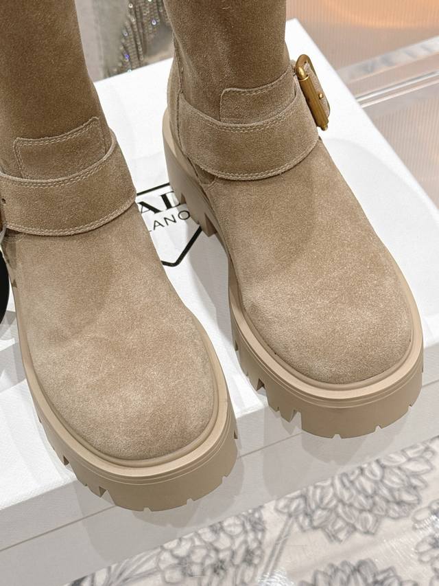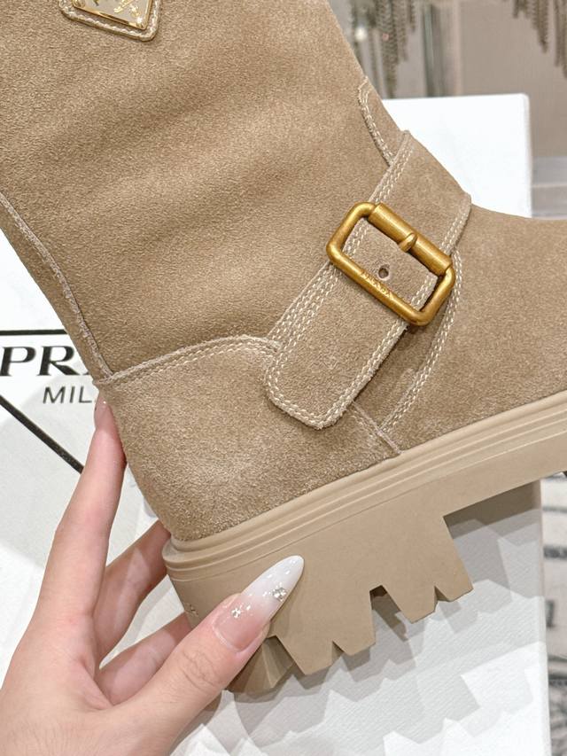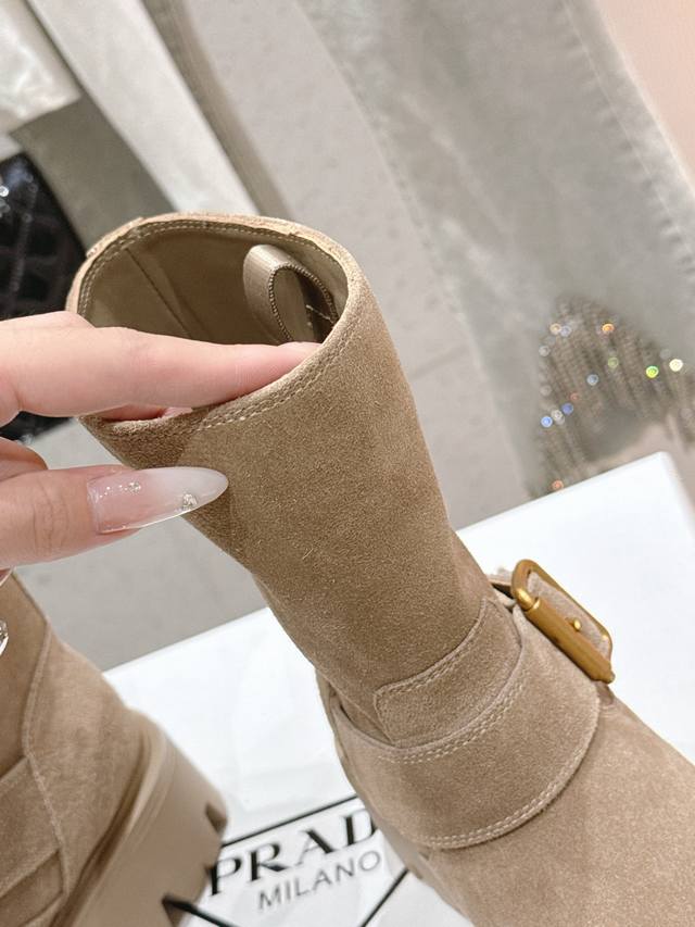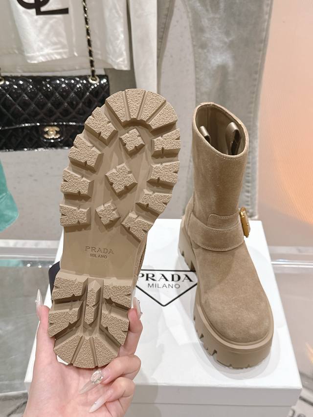 普拉达F041系列 最新三角扣厚底中筒靴马丁靴,非常耐看的一款.