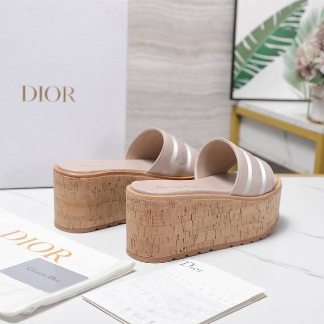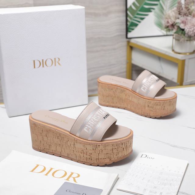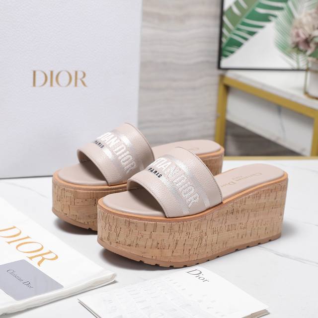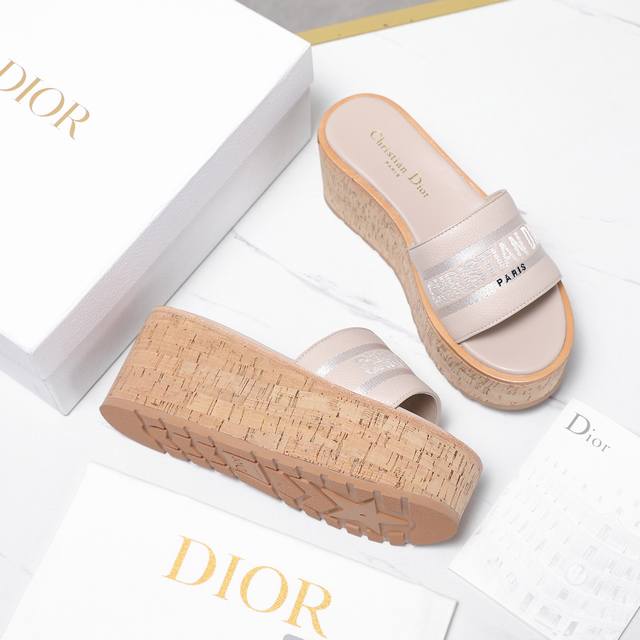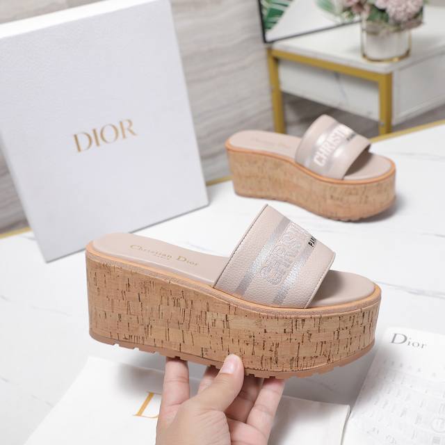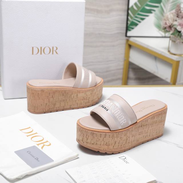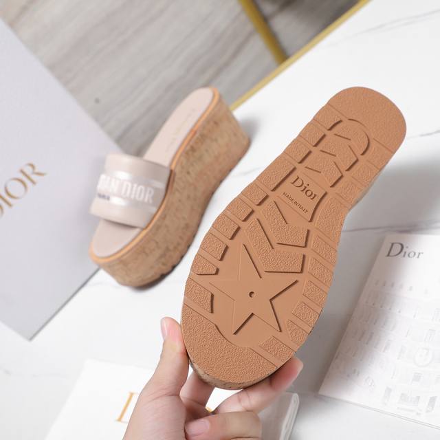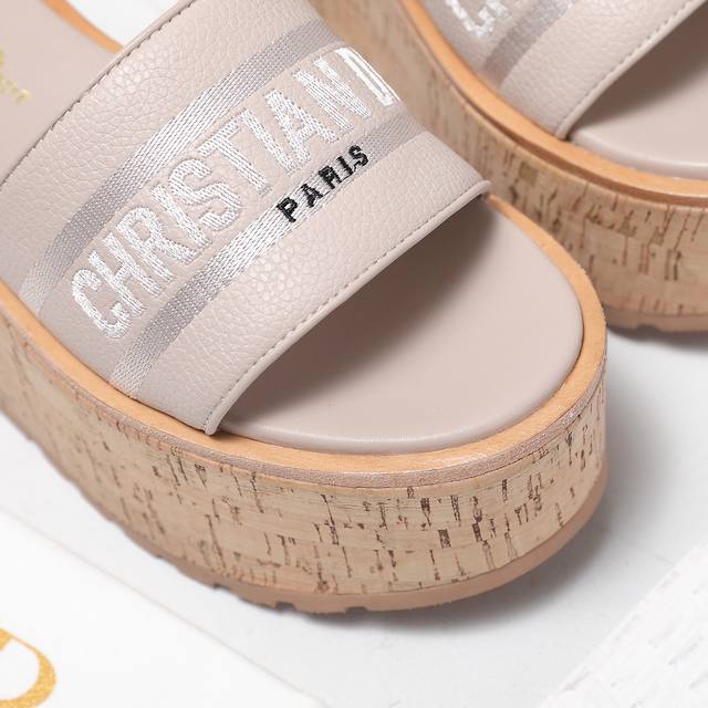 Dio*R 迪奥Dway厚底凉拖鞋防水台软木底厚底高跟拖鞋粒面牛皮坡跟拖鞋