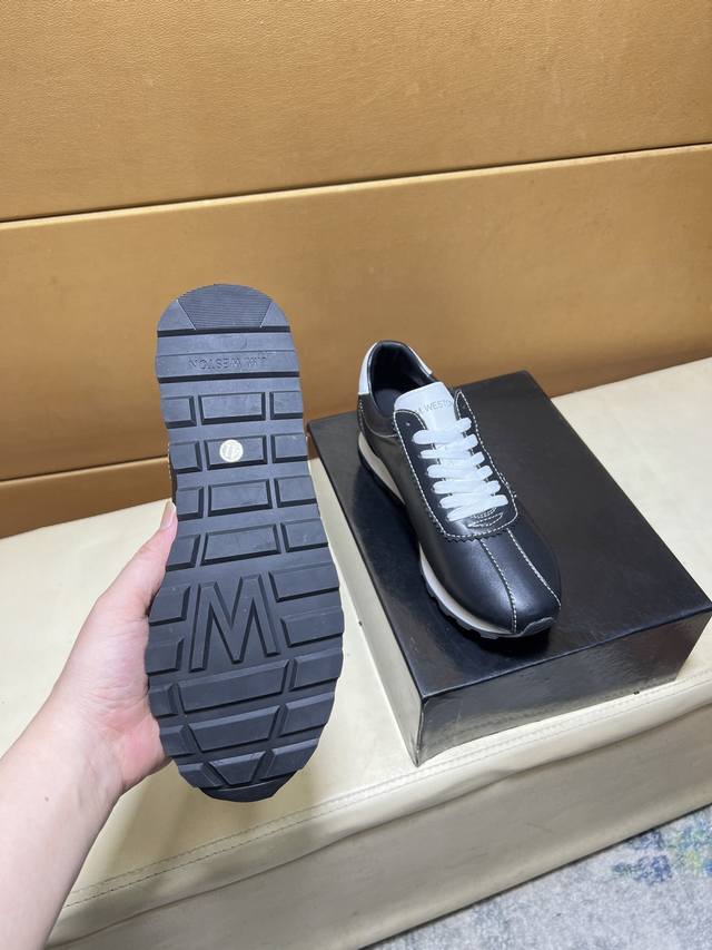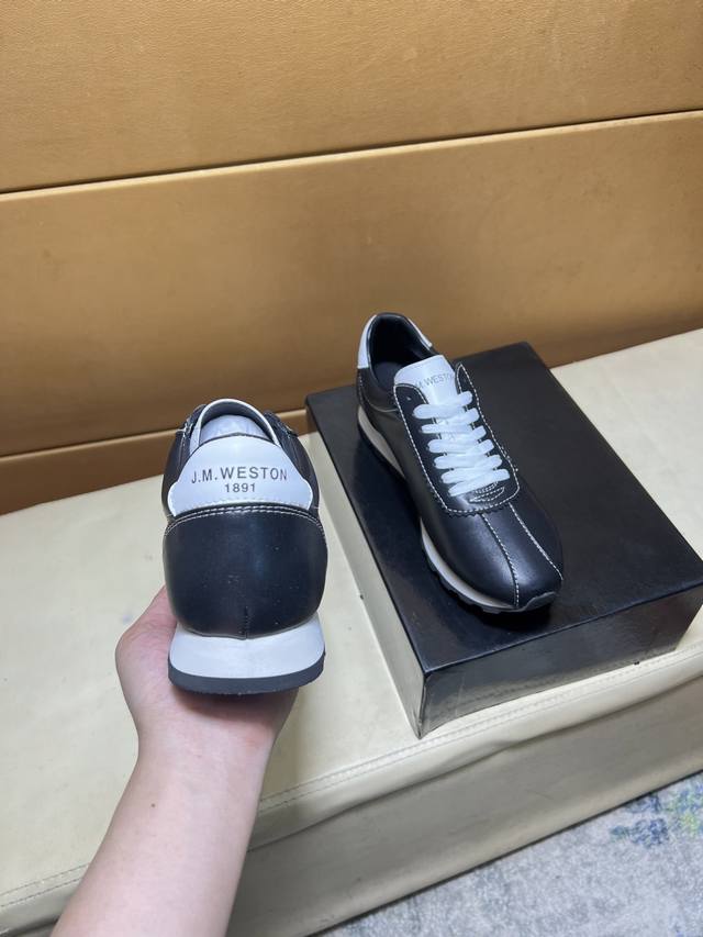 独家首发 J.M Weston 独特现代风运动鞋。专柜代购休闲 意大利进口原版皮, 猪里 拒绝脱色磨脚 鞋底:原厂特供原版底,超酷 系带走路都带风风格设计 原单品质全真皮制作,超舒服耐磨防滑原版底 。就好像实物拍摄实物更赞 适合户外,驾车完美高品质板鞋 男鞋码数:38-46