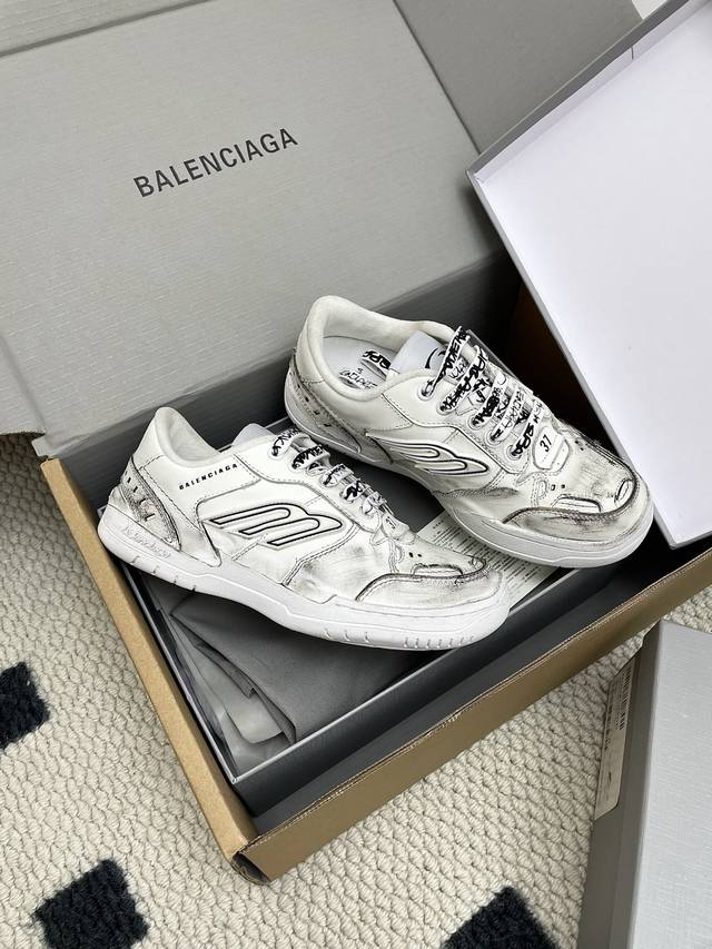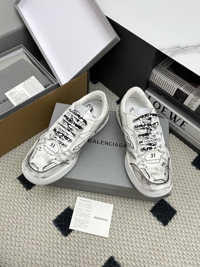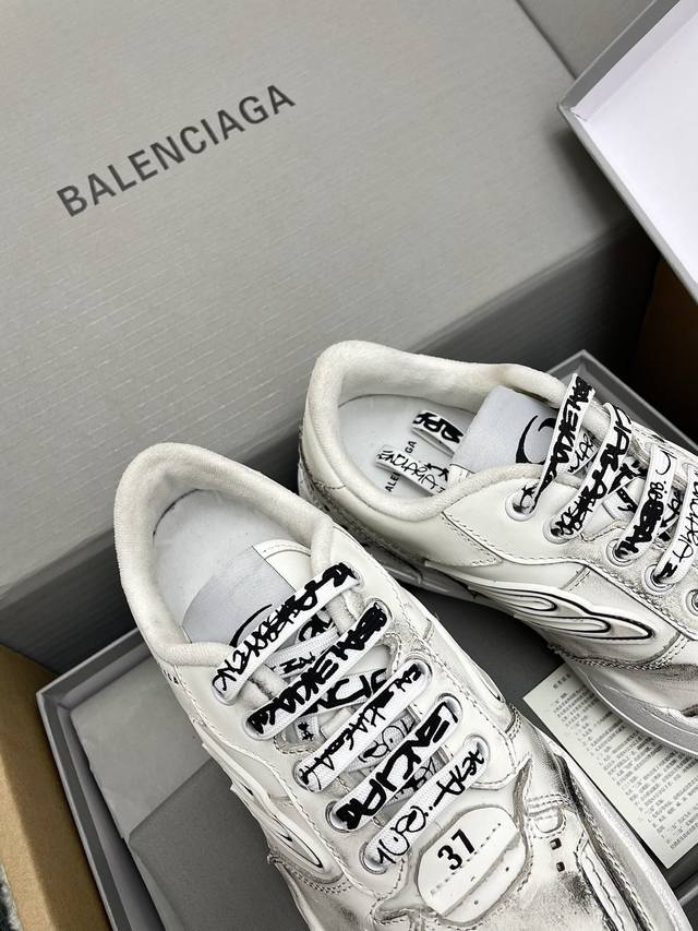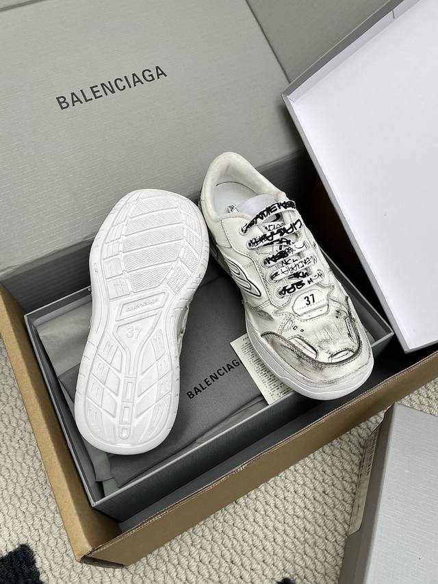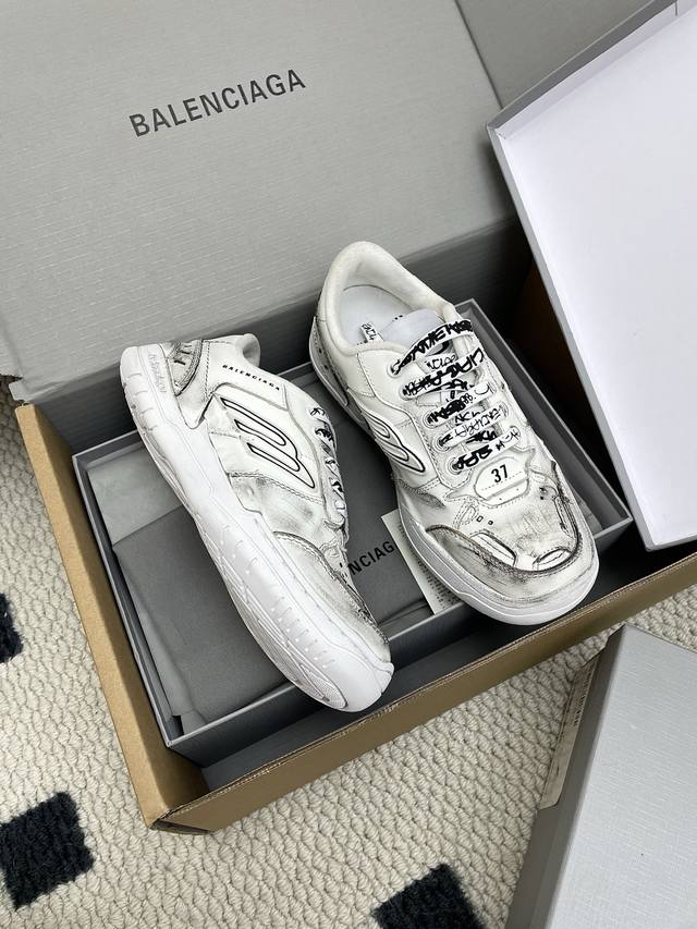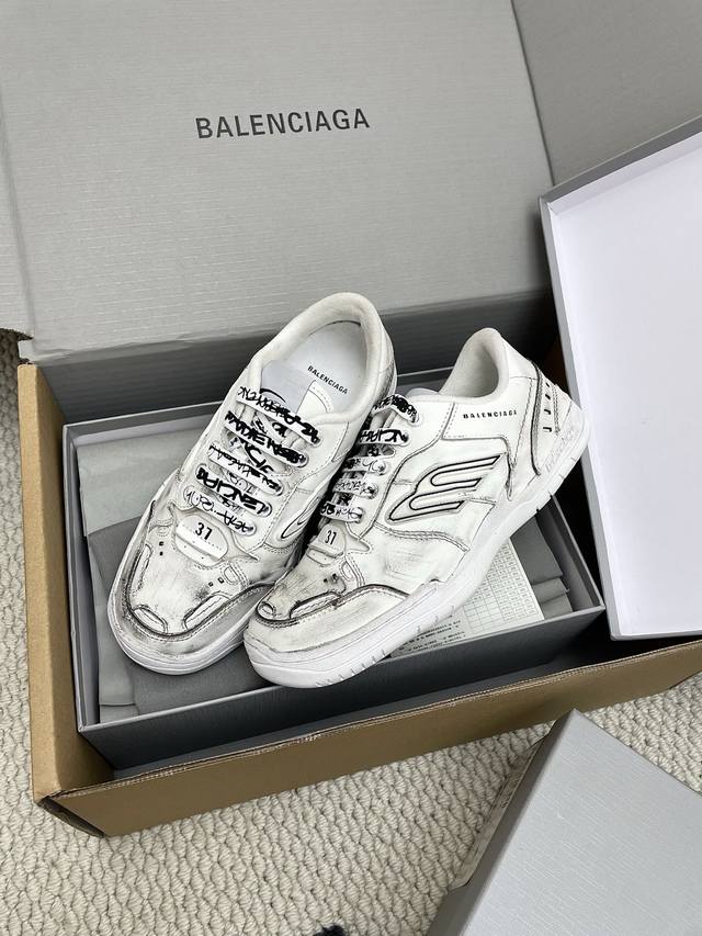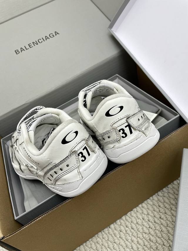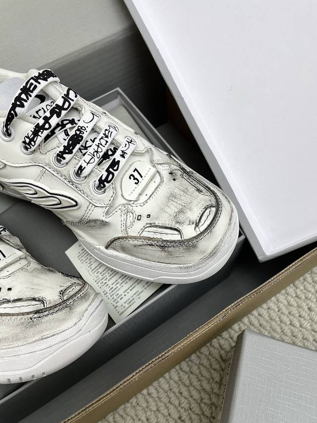 原版购入开发 做货 Hamptons Sneaker这款新鞋延续了创意总监Demna一贯的美学风格,融入了毛边设计、外露缝线、不对称细节、做 刮痕,以及涂鸦风格的鞋带字样和明显的鞋头弧度。不同于此前夸张厚重的3Xl和 Cargo等款式,Hamptons Sneaker 在轮廓上有所收敛,采用了巴黎世家较少使用的更为传统的鞋底结构,并配有拼接皮革鞋面,使整体造型更加日常但依然不失个性
