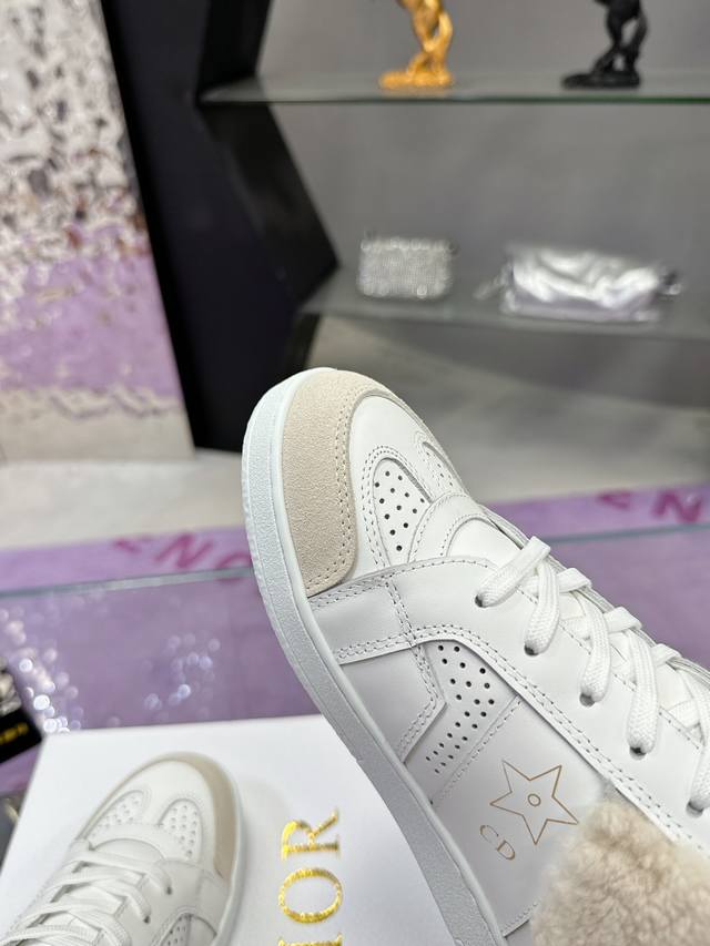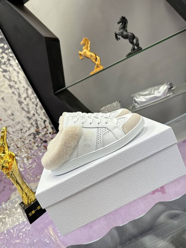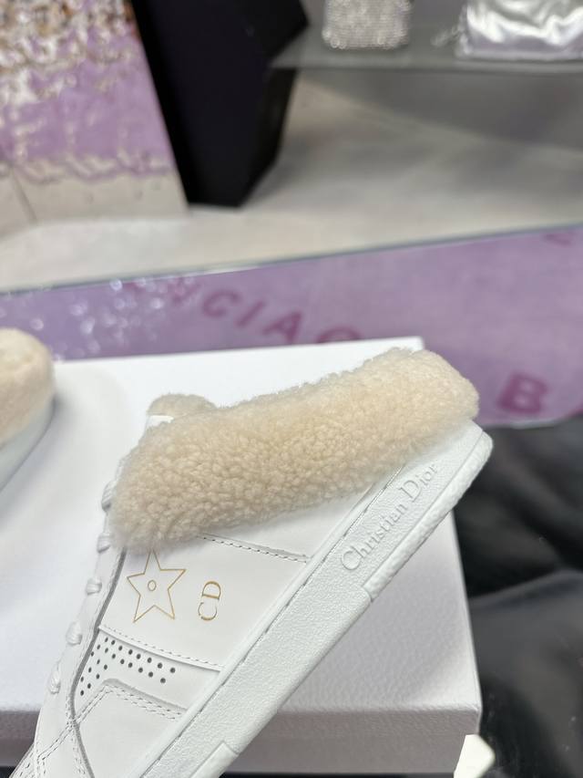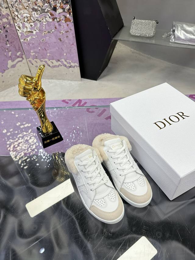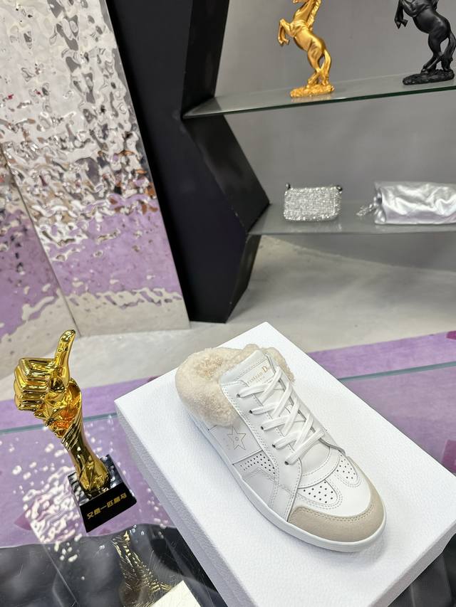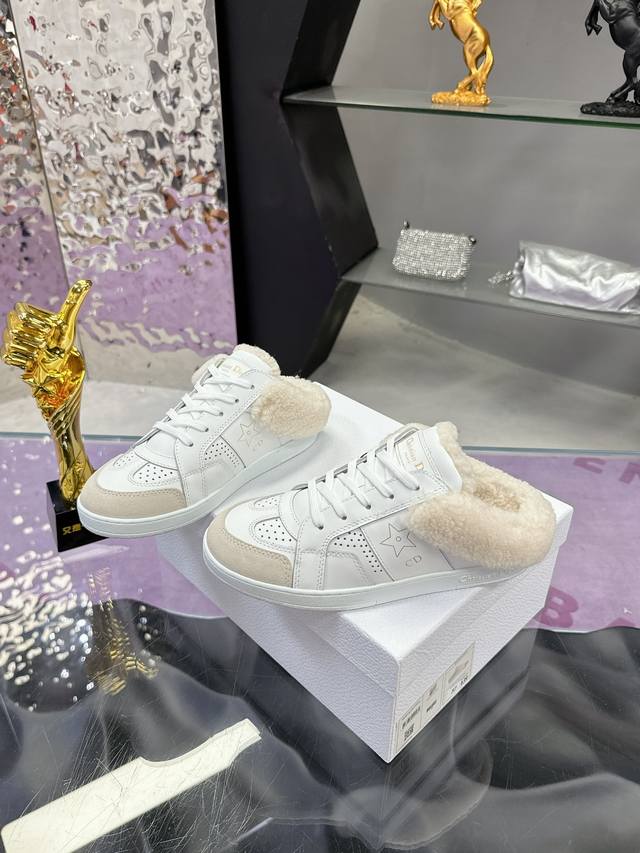 迪奥毛半拖系列Dior Star运动鞋是一款时尚单品,进一步丰富该系列。露跟式设计,搭配白色羊皮革效果里料,突显与众不同的风格。