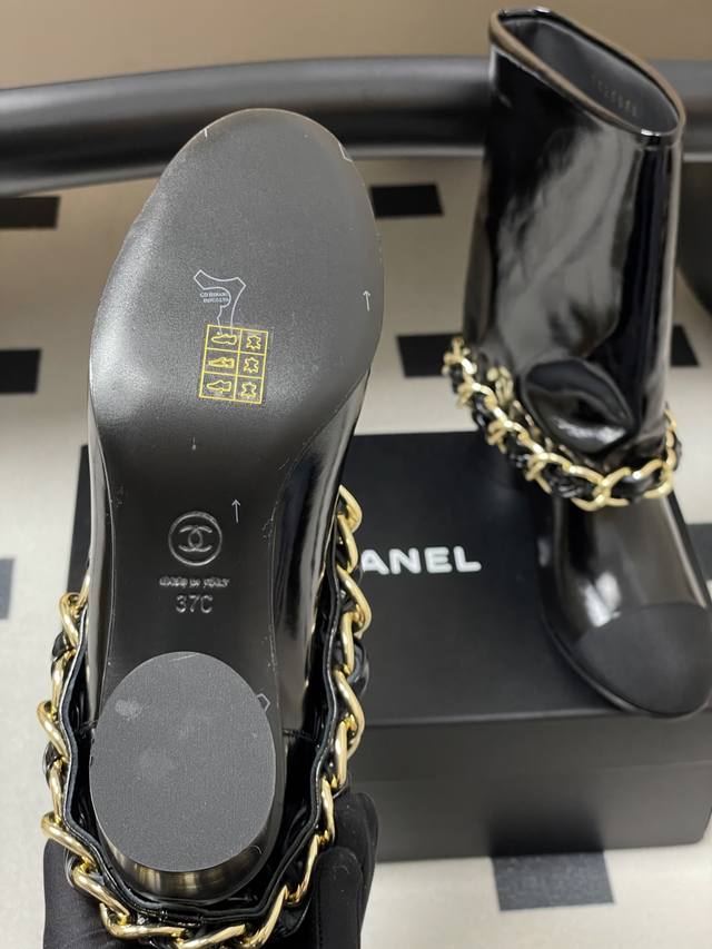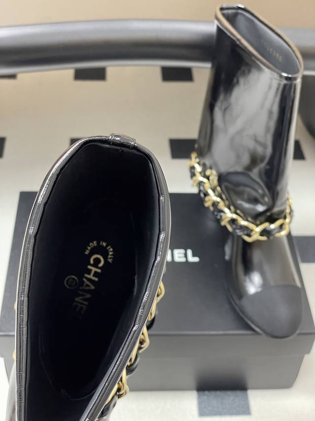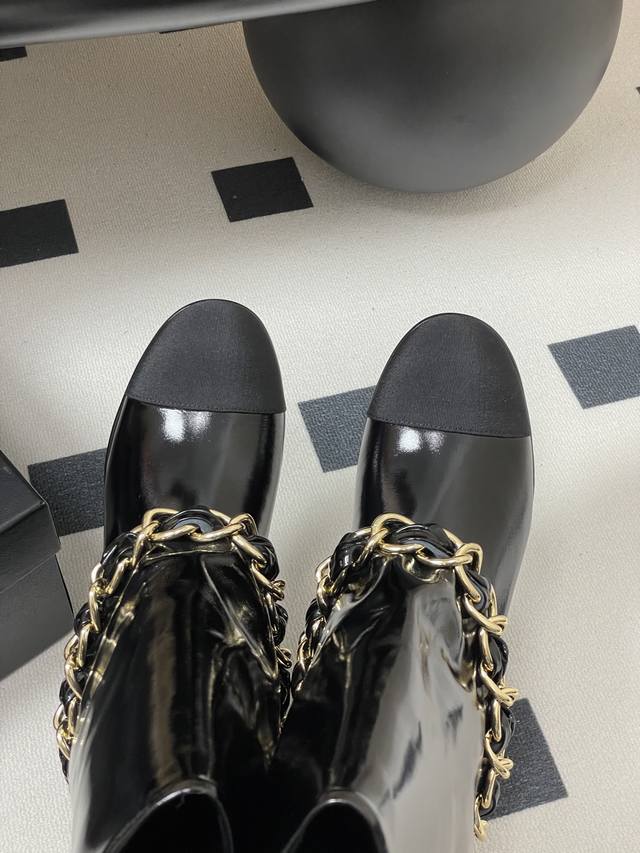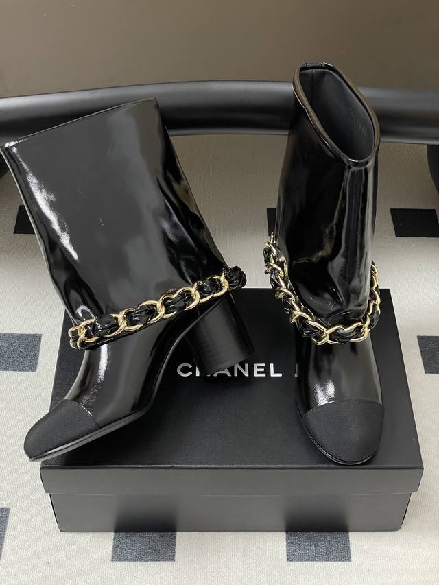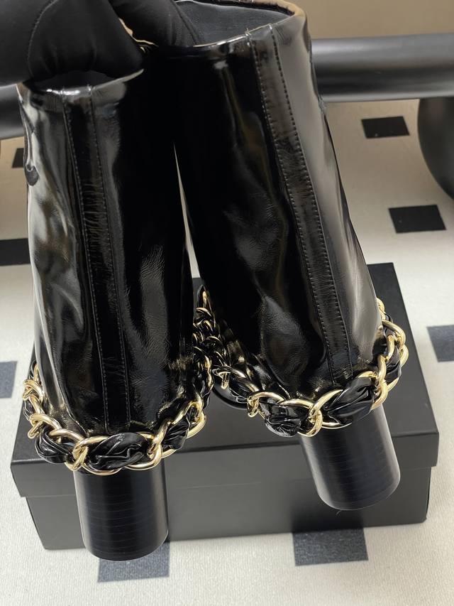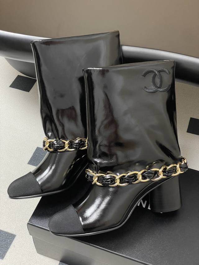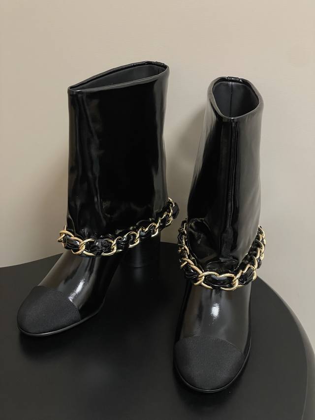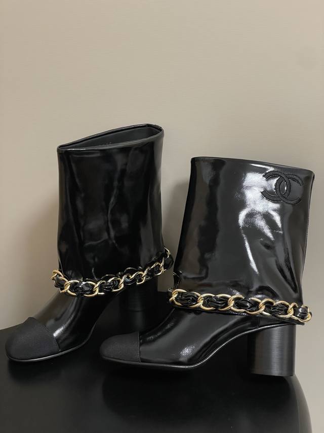 秋冬走秀新款Chanel 小香25B秋冬走秀款翻口大链条短靴 粗跟裤管靴
