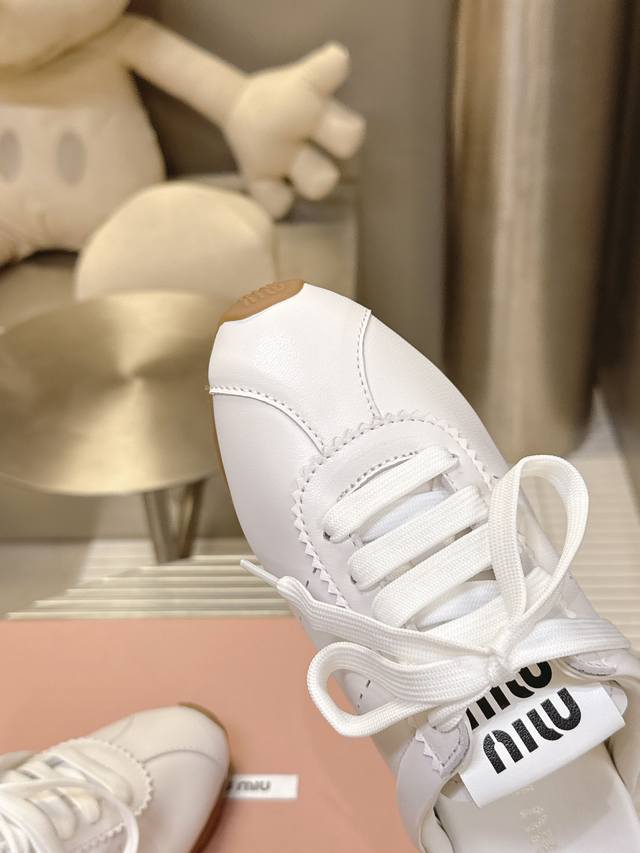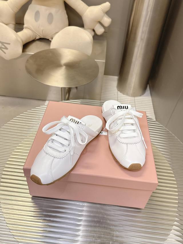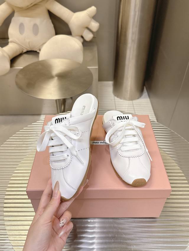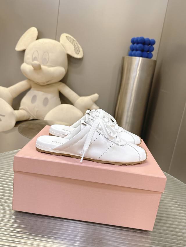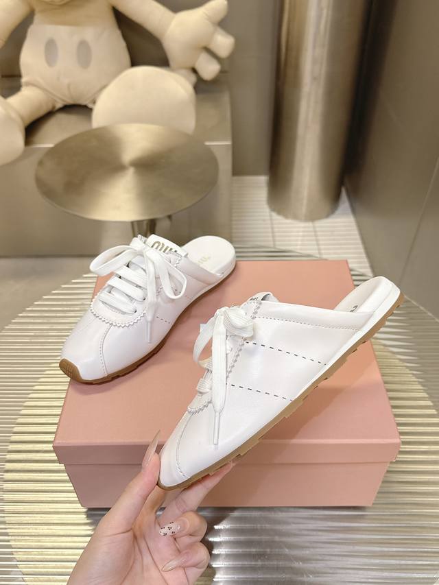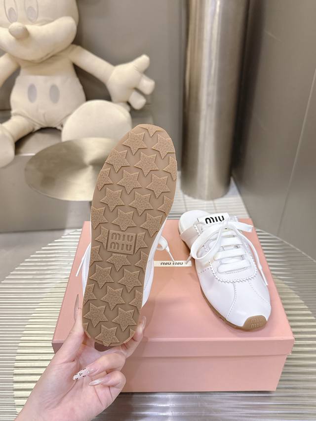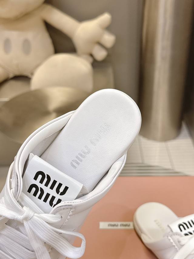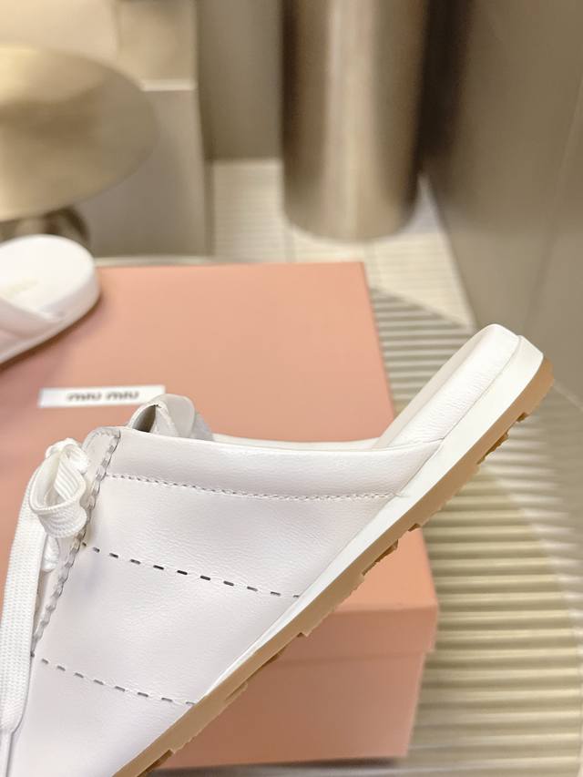 可调节绑带贴合脚踝,慵懒中带点小精致,走路带风不拖沓。鞋舌点缀经典Miumiu字母Logo,细节控狂喜,随手一拍都是Ins风大片。